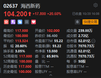 海西新药上市首日涨超20%。公开发售阶段海西新药获约3165.1倍超额认购,共接获近31.61万份有效申请。由于认购倍数极高,公开发售股份最终数目为115万股,占全球发售股份总数的约10%。申购一手的投资者获配发股份的几率极低,中签率仅为1%,需认购30万股方可稳获一手。国际配售部分同样获得超额认购,倍数约为6.3倍。