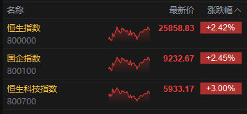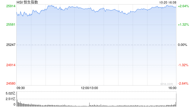 10月20日消息,港股三大指数集体上涨。截至收盘,恒生指数涨2.42%,报25858.83点,恒生科技指数涨3.00%,国企指数涨2.45%。盘面上,科网股全线上涨,网易涨超5%,阿里巴巴涨超4%,腾讯、百度涨超3%,哔哩哔哩、京东、小米、美团涨超2%,联想、快手涨超1%;航空股大涨,东方航空涨超9%;芯片股走强,中芯国际涨近4%;黄金股普跌,珠峰黄金跌10%;海西新药上市首日涨超20%。