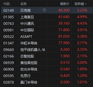 芯片股走强,中芯国际涨近4%。东吴证券分析指出,海外半导体管制政策加速国产替代进程,国内晶圆厂核心工艺设备(如光刻、刻蚀、薄膜沉积)国产化率有望进一步提升;叠加存储价格持续上行、先进制程扩产提速及国产算力需求增长,制造端投资机遇显著。