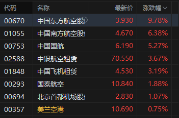 航空股大涨,东方航空涨超9%。信达证券表示,行业客座率持续高位,国内外航线出行两旺,近期票价已实现持续转正,航司单位座收或显著修复。同时,随着“反内卷”措施及《公约》的落实,行业恶意低价现象有望消减,或能带动票价有所修复,进一步推动航司单位座收回升。叠加油价下行带来的成本下降,航司盈利或能进一步增长。