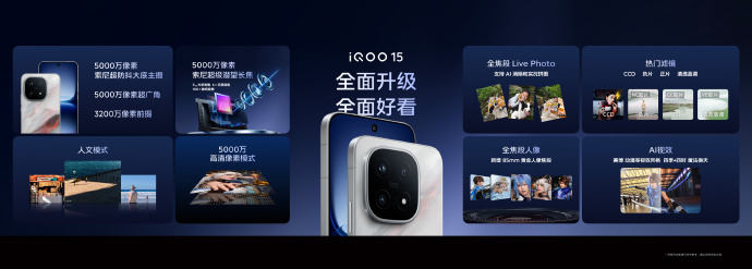 影像方面,iQOO 15搭载5000万像素索尼超防抖大底主摄、5000万像素超广角、3200万像素前置、5000万像素索尼Pro级潜望长焦,还有Live Photo、AI视效等趣味玩法。