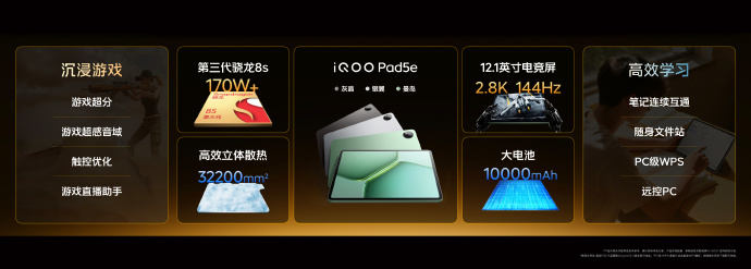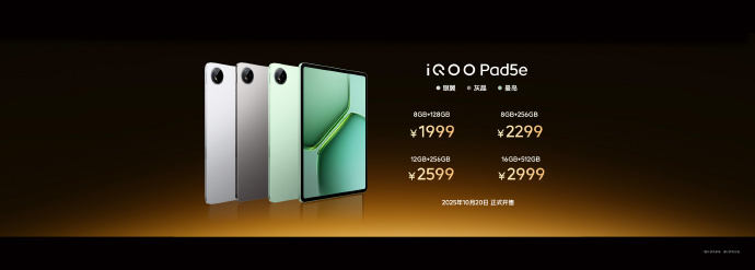 凤凰网科技讯 10月20日,iQOO Pad5e平板发布,该平板采用第三代骁龙8s,搭配12.1英寸2.8K电竞屏、32200mm?高效立体散热,售价1999元起。 iQOO Pad5系列支持旗舰同款自研超分方案等多项游戏自研技术、iQOO 15同款游戏超感音域,新品还支持笔记连续互通、PC级WPS等。
