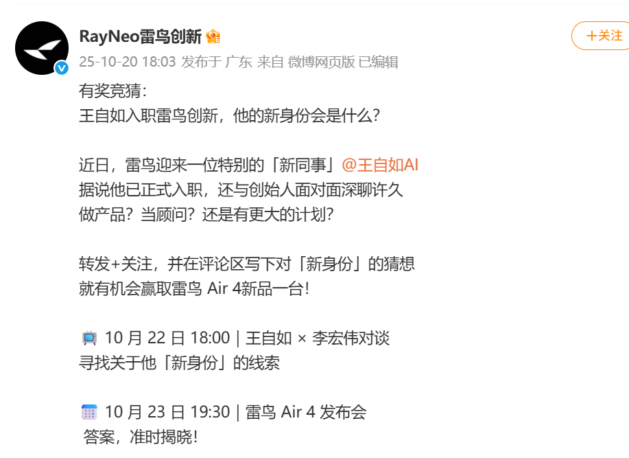10月20日,@雷鸟创新发文官宣王自如入职。具体职务将在10月23日雷鸟Air 4发布会公布。