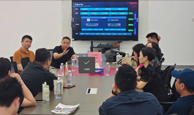 在新能源领域,元征展厅也有专门区域展示了相关诊断及动力电池包维保设备。由于媒体团中有不少新能源车主,大家对元征自2023年起推出的LAUNCH EVS新能源站表现出兴趣。LAUNCH EVS新能源站是元征以品牌技术赋能行业,助力维修厂扩展新能源维修业务的举措之一,反映出元征在新能源领域的布局。拥抱新能源,拥抱行业更多可能。 “AI智能维修大模型”成全场焦点,突破汽车维保时空限制 在展厅参观结束后,媒体团和元征代表共同参与了交流座谈会。会上, “AI智能维修大模型”成为热议焦点。作为技术代表,产品经理安海月先生以“元征AI――重构汽修服务新生态”为主题,分享了公司对于AI技术的发展蓝图。与此同时,蒋总进一步展示了即将上市的元征新品 “AI OBD”。