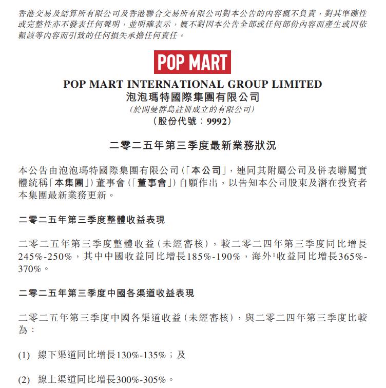 泡泡玛特在港交所公告,第三季度整体收益(未经审核),较二零二四年第三季度同比增长245%-250%,其中中国收益同比增长185%-190%,海外收益同比增长365%-370%。
