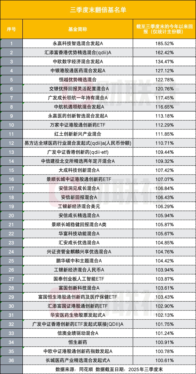 财联社10月21日讯(记者李迪)股市高位震荡,让“翻倍基”数量也骤然减少。 今年三季度末,全市场有36只基金年内收益超过100%。截至10月20日,10月以来仅8个交易日,只剩下11只基金年内收益超过100%。 现存的11只“翻倍基”规模普遍偏小,仅永赢科技智选、中欧数字经济、中航机遇领航3只产品的规模超10亿。 ![]() 另外值得注意的是,上述11只“翻倍基”中包含多家中小公募旗下的产品。这体现出,中小公募在投研领域仍能打造出差异化优势。比如在港股创新药赛道,中银基金旗下产品年内业绩超过广发等头部公募旗下产品;在北交所产品赛道,中信建投基金旗下产品年内业绩超过华夏、嘉实等多家头部公募的产品。 “翻倍基”数量骤减 同花顺数据显示,截至今年三季度末,共有36只年内收益超100%的翻倍基,其中包含28只主动型产品和8只被动型产品。 ![]() 10月以来,市场震荡加剧,翻倍基数量也骤减。 具体来看,热门科技板块的震荡让许多主题基金跌出“翻倍基”名单。 以医药主题基金为例,广发中证香港创新药ETF发起式联接(QDII)A、永赢医药创新智选混合发起A在今年三季度末均位列“翻倍基”名单中,但这两只基金10月以来的跌幅超过9%,截至目前的年内涨幅也收窄至100%以内。 还有多只主动型基金仓位集中于热门科技板块,因而近期回撤较多,目前已跌出“翻倍基”名单。以鹏华碳中和主题混合A为例,该只基金重点布局制造业、新能源、新技术等,截止三季度末的收益达104.42%。但由于投资板块震荡幅度加大,该基金10月以来的跌幅达-10.69%,因而跌出“翻倍基”名单。 此外,重仓人形机器人板块的华富科技动能混合A、重仓算力板块的大成科技创新混合A也于近期跌出“翻倍基”名单。 截至10月20日,市场上仅有11只翻倍基,均为主动型产品。业内人士指出,被动型产品以跟踪指数为核心,无法依靠基金经理的主动管理来控制回撤。这类产品在市场回暖时锐度更高,但在市场震荡期间也可能会产生较大回撤,因而近期多只被动型产品跌出“翻倍基”名单。 上述11只翻倍基的规模均相对偏小。其中7只产品在二季度末的规模不足5亿,仅永赢科技智选混合发起、中欧数字经济混合发起、中航机遇领航混合发起在二季度末的规模在10亿以上(各类份额合并计算)。 此外,同泰产业升级今年以来收益也超过100%。该基金同样规模偏小,且在今年二季度时曾出现机构大额赎回,当时机构赎回产生的赎回费导致基金业绩暴涨,因而被剔除在统计范围内。 上述翻倍基中,永赢科技智选混合发起A收益最高。截至10月20日,该只产品的今年以来收益达175.87%。该产品的基金经理为任桀,投资方向聚焦全球云计算产业。 另外值得注意的是,目前的翻倍基中,港股主题基金仅剩2只,分别是汇添富香港优势精选混合(QDII)A和中银港股通医药混合发起A。而今年三季度末时,还有9只港股主题基金位列“翻倍基”名单中。 业内人士分析指出,高收益产品往往伴随较高波动。近期市场震荡加剧,多只此前表现亮眼的绩优基金净值出现明显波动,“翻倍基”数量骤减是正常现象。当前仍能留在“翻倍基”名单中的主动型产品,一方面是回撤控制能力较好,另一方面是前期积累了较为丰厚的浮盈。 中小公募多只产品突围 分基金管理人来看,上述11只“翻倍基”分别来自11家公募基金公司,并且每家公募基金公司旗下当前仅有一只翻倍基。 这些“翻倍基”中,还包含多家中小型公募旗下的产品,如恒越优势精选混合、中航机遇领航混合发起A、红土创新新兴产业混合、中银港股通医药混合发起A、汇安成长优选混合A等。 这些基金多为专注投资某个热门领域的产品。以中航机遇领航混合发起A为例,该基金上半年以AI算力为主要投资方向,重点配置与光通信、AI服务器相关的投资标的。中银港股通医药混合发起A则专注投资创新药龙头公司。 另外值得注意的是,目前所有的北交所产品中,仅剩一只翻倍基,为中信建投北交所精选两年定开混合A。 作为中小型公募,中信建投基金旗下的该只北交所产品业绩优异,年内收益远超头部公募华夏基金旗下的北交所产品。截至今年10月20日,北交所产品的业绩亚军为华夏北交所精选两年定开混合发起,该产品的今年以来收益为85.48%,与业绩冠军的差距超过20个百分点。 业内人士指出,中小公募多只产品跻身“翻倍基”名单,体现出中小公募在投研领域仍能打造出差异化优势。 头部公募有更多资源打造完善全面的投研平台,中型公募虽然人才数量和投研资源有限,但依然可以在细分领域或特定赛道深耕,与头部公募形成差异化竞争优势。比如在港股创新药赛道,中银基金旗下产品年内业绩超过广发等头部公募旗下产品;在北交所产品赛道,中信建投基金旗下产品年内业绩超过华夏、嘉实等多家头部公募的产品。 |