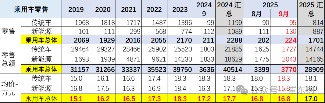 图片来源:崔东树公众号 从今年前9个月来看,新能源乘用车型的降价力度均值为2.1万元。“今年1至9月的新能源乘用车降价规模相对温和。”在崔东树看来,目前的价格竞争主要是新车推出直接突破原有价格的下限,而不是增配不降价的模式,比如9月直接降价的车型仅有1款,新车增配降价是提升性价比的较好方式。 记者注意到,增配降价已是多款热销车型抢市场的新花样。“理想i8原来有三个版本,现在统一为一个版本,很多配置也变成标配,售价33.98万元。另外之前需要额外付费加装的配置也直接成了标配,并且新增了一些选装配置。”一位理想体验中心销售人员向记者表示。 新能源车为何又降价? 从过去六年来看,新能源乘用车均价在波动中下降。公开数据显示,2019年至2014年,新能源乘用车均价分别为16.8万、17.5万、16.3万、16.9万、18.4万和16.3万元。今年前9个月,新能源乘用车均价已跌至16万元。 价格变化主要是受产品结构变化影响。崔东树认为,近几个月新能源乘用车均价下降的结构性原因是入门级纯电动的占比提升,价格较高的混合动力及增程式的占比下降,形成结构性拉动。 乘联分会数据显示,今年9月,微型新能源乘用车渗透率100%,A0级新能源乘用车渗透率达到80%,A级新能源乘用车渗透率达到44%。