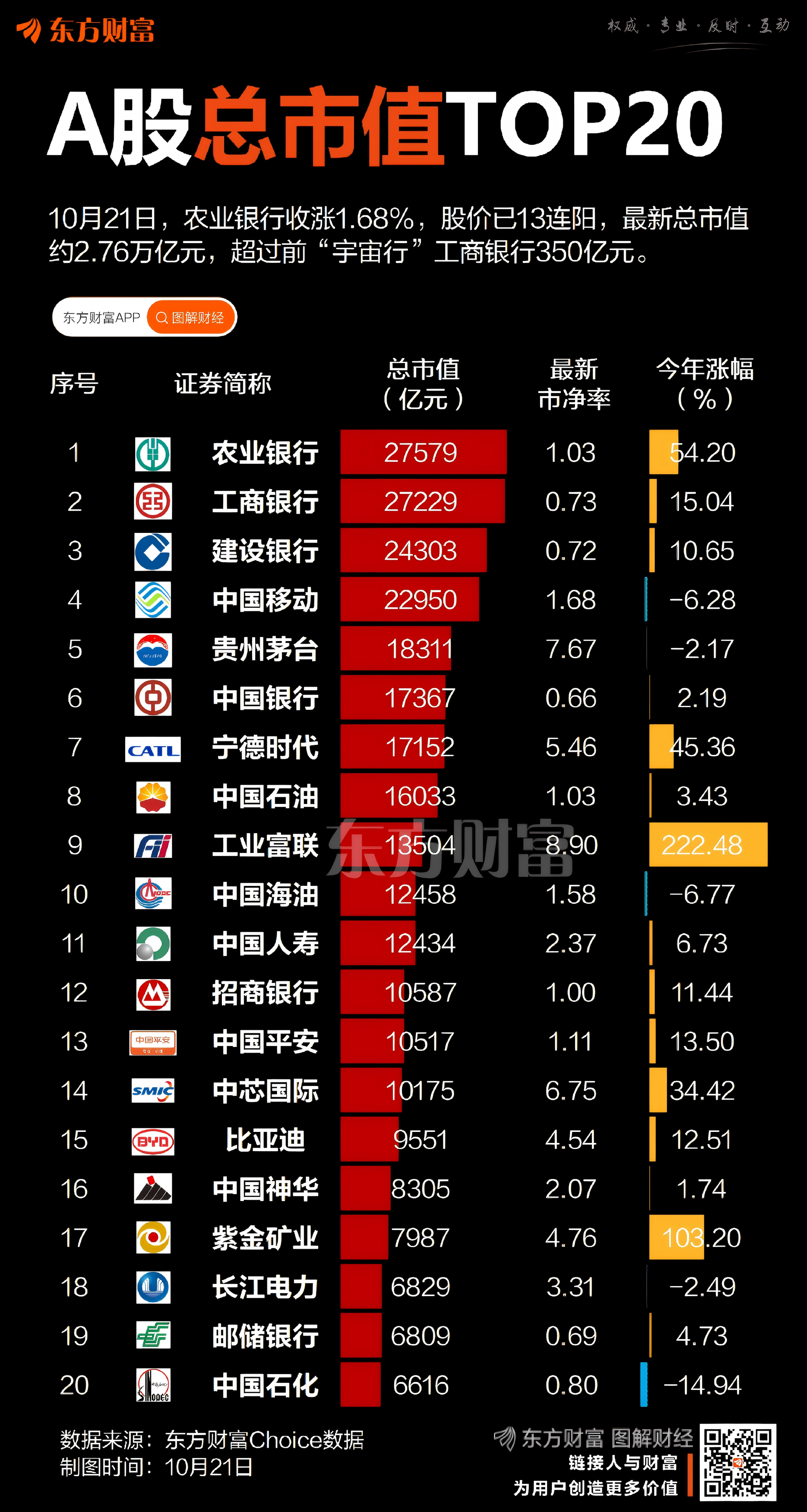 13连阳!农行总市值超2.75万亿 年内暴增近9000亿元 炒股第一步,先开个股票账户 ![]() 10月21日,农业银行股价再创历史新高,最新总市值2.76万亿元,位列A股第一,市值已领先前“宇宙行”工商银行一个身位。 据丁冬财经Choice数据,去年末,工商银行的总市值为2.47万亿元,还领先当时的农业银行约6000亿元。今年以来,农业银行股价上涨54.20%,总市值大增近9000亿元,同期工商银行的涨幅只有15.04%,总市值仅增加了2500余亿元,从而被农业银行反超。 不过,农业银行年内总市值增加了近9000亿元,这一数据却并不是同期最多,年内总市值增加最多的是工业富联。去年末,工业富联的总市值只有4272亿元,排名A股第24。今年该股暴涨222.48%,总市值暴增9232亿元,最新总市值已达1.35万亿元,排名升至A股第9。 在经历了年内的大涨后,农业银行的最新市净率达1.03,是A股唯一一只没有破净的银行股。数据显示,当前,中证银行指数42只成分股中除农业银行外全部破净,平均市净率只有0.64,其中,民生银行的市净率最低,仅为0.31;招商银行的最新市净率为0.997,有望成为农业银行之后下一只突破1的银行股。