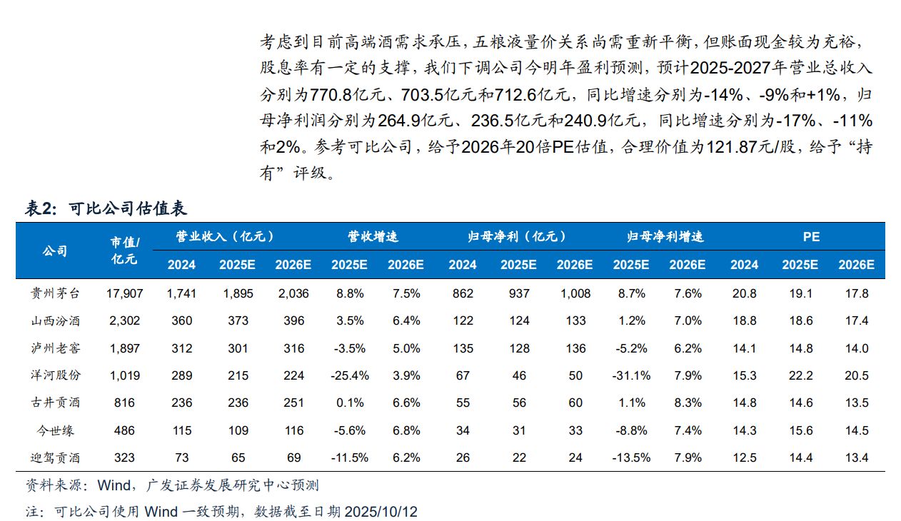 全新妙想投研助理,立即体验 近期,一份广发证券关于白酒2025年三季报业绩前瞻的研报在白酒圈激起千层浪。该份研报预测,白酒巨头五粮液三季度营收可能同比下滑30%、净利润同比下滑45%。 值得关注的是,上述预测数据与申万、国信等多家头部券商的预测数据相去甚远。 那么,广发证券关于五粮液净利润的预测依据到底是什么?为什么会抛出“五粮液与泸州老窖‘易位’”的观点?《每日经济新闻·将进酒》记者对此展开了调查分析。 广发证券预测:五粮液三季度净利润下滑45% 上周,广发证券发布《白酒持续调整,大众品表现分化——2025年三季报业绩前瞻》研报,对白酒上市公司三季度业绩进行了详细预测分析。总体来看,广发证券认为,步入8月后,随着政策在执行层面的规范与完善,白酒需求环比有所改善,但同比仍承压。从经销商回款进度看,预计厂商博弈下,多数厂家放松回款要求/不再强制性要求打款,部分头部酒企表现相对较优。 鉴于此,该券商预计2025年三季度白酒企业表端业绩将进一步向实际动销收敛。分价格带看,预计高端酒中,贵州茅台有望展现强韧性;次高端商务需求仍弱,汾酒优势领先;地产酒龙头持续调整。 ![]() 《每日经济新闻·将进酒》记者注意到,广发证券这份白酒公司业绩预测数据整体上与其他券商较为一致,差距不大,但唯独在对五粮液的判断上显得格格不入。 广发证券称,弱需求下,五粮液的普五批价持续回落,当前约820元/瓶,较年初下降100元/瓶。2025年三季度公司着眼于长期高质量发展,或将主动进行调整,去化渠道库存,稳定产品价格、巩固经销商信心。广发证券预测,五粮液2025年三季度营收同比下滑30%,归母净利润同比下滑45%。 而同样是分析主动调整,相比之下,招商证券的预测则要温和许多——五粮液多数经销商全年任务完成率较去年同期慢10%左右,前期普五批价较低导致经销商回款意愿较弱,近期酒厂返利与补贴力度加大,经销商信心有所提振,双节动销略好于竞品;预计2025年三季度报表调整幅度环比扩大,利润由于价格/补贴因素下滑高于收入,预计五粮液三季度收入和利润同比减少8%和13%,报表进入出清。 ![]() 对于券商的季报预测数据,《每日经济新闻·将进酒》记者以投资者身份致电五粮液证券部。该公司证券部工作人员回应称:“今年国庆中秋双节的动销与往年相比,确实要平淡一些,但是(目前)没法给一个定量的数据。至于券商的季报预测,每个券商的调研数据不同,得出的结论肯定也不同。(对此)公司没办法去澄清,因为澄清回应券商预测就会涉及内幕信息泄露,所以业绩数据可以等我们三季报发布。” 抛出“五粮液、泸州老窖‘易位’”的观点 与此同时,广发证券还发布了题为《五粮液(000858.SZ)量价需再平衡,下调今明年盈利预测》的研报。在这份研报中,广发证券更是抛出了“五粮液、泸州老窖‘易位’”的观点。 ![]() 广发证券分析指出,2021年以来,白酒行业经历调整期,在此背景下,多数白酒产品的价格出现回落。五粮液和国窖作为千元价格带的参与者,经常被消费者和投资人拿来比较。 2021年~2022年,在行业调整初期,泸州老窖依靠低度国窖(38度)在北方市场的发力,给高度国窖(52度)纾解压力。2024年至今,随着泸州老窖数字化系统赋能和大本营市场的深耕,2025年二季度开始,高度国窖的批价超过五粮液。而在两轮价格赶超的背后,亦伴随着五粮液管理层频繁的变动,给了国窖进一步缩小差距的机会。 广发证券总结道,“白酒行业的弯道超车可谓是‘滴水石穿’,茅台超过五粮液经历十余年,并在本轮跟五粮液拉开‘代际差异’,行业调整期弯道超车的机会又来临。” 另外,对于五粮液高端产品占比逆势上行的情况,广发证券也理解为五粮液的供需关系失衡。其在研报中称,2021年以来,伴随着经济的转型发展,高端白酒的消费场景有所下降。在此背景下,贵州茅台、山西汾酒、泸州老窖、洋河股份、今世缘等公司纷纷发力中低端产品。2022年~2024年,贵州茅台的高端酒(茅台酒)收入占比逐年下降,今年上半年由于政策端影响,贵州茅台的高端酒(茅台酒)占比回落幅度加大。 而五粮液的高端酒占比变化趋势则恰好相反——2022年~2024年,高端酒(五粮液产品)占比逐年上升,2025年上半年上行斜率还有小幅增加。五粮液高端产品营收占比与行业趋势相悖,结合市场价格的快速下行来看,或可以反映出五粮液为了奋力完成年度目标,供需关系失衡。 最后,广发证券在进行未来三年业绩预测时表示,五粮液2025年和2026年或将迎来业绩持续下滑,预计2026年净利润将下滑至236.5亿元;而对于白酒TOP6的其他5家公司,贵州茅台、山西汾酒、泸州老窖、洋河股份以及古井贡酒,则给出了2026年净利润均将实现增长的预测。 ![]() 对于广发证券这番预测到底有哪些确切数据支撑,《每日经济新闻·将进酒》记者致电研报发布者广发证券分析师符蓉座机,但截至发稿未能接通,其也未在邮件进行回应。 (文章来源:每日经济新闻) |