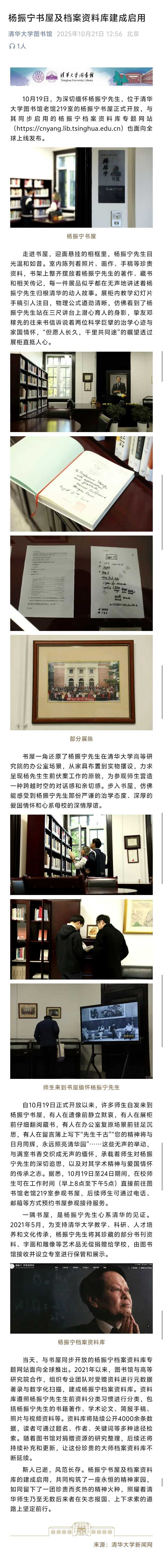 凤凰网科技讯 10月21日,据清华大学图书馆消息,为深切缅怀杨振宁先生,位于清华大学图书馆老馆219室的杨振宁书屋正式开放,与其同步启用的杨振宁档案资料库专题网站也面向全球上线发布。 据官方介绍,室内陈列着照片、画作、手稿等珍贵资料,书架上整齐摆放着杨振宁先生的著作、藏书和相关传记。 书屋一角还原了杨振宁先生在清华大学高等研究院的办公室场景,从家具布置到实物摆设,力求呈现杨先生生前伏案工作的原貌,为参观师生营造一种跨越时空的对话感和亲切感。