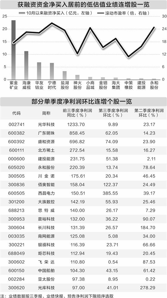 10月以来获融资资金净买入居前的低估值业绩连增股一览 在丁冬财经看资讯行情,选丁冬财经证券一站式开户交易>> 据证券时报·数据宝统计,截至10月21日,在已正式发布三季报的140多只个股中,有70余只个股第三季度净利润环比增长,占比过半。其中,第二季度实现盈利且第三季度净利润环比增幅超50%的个股有21只,光莆股份、海通发展、翔丰华、美芯晟等8只个股环比增幅超100%。 把统计范围扩大至已披露业绩预告的上市公司,数据宝按三季报、业绩快报、预告净利润下限(无下限则取公告数值)统计,2025年前三季度实现盈利,且第二季度和第三季度净利润均环比增长的个股有80只。 从估值水平来看,数据宝统计,截至最新收盘,上述80股中,有28股滚动市盈率低于30倍。资金面上,部分业绩环比持续提升的低市盈率个股获得融资资金加仓。数据宝统计,10月以来融资资金净买入超1亿元的低估值股有7只,分别为紫金矿业、海康威视、华友钴业、宁德时代、盐湖股份、神火股份、小商品城。紫金矿业融资净买入额23.49亿元,排在第一位。 ![]() (文章来源:人民财讯) |