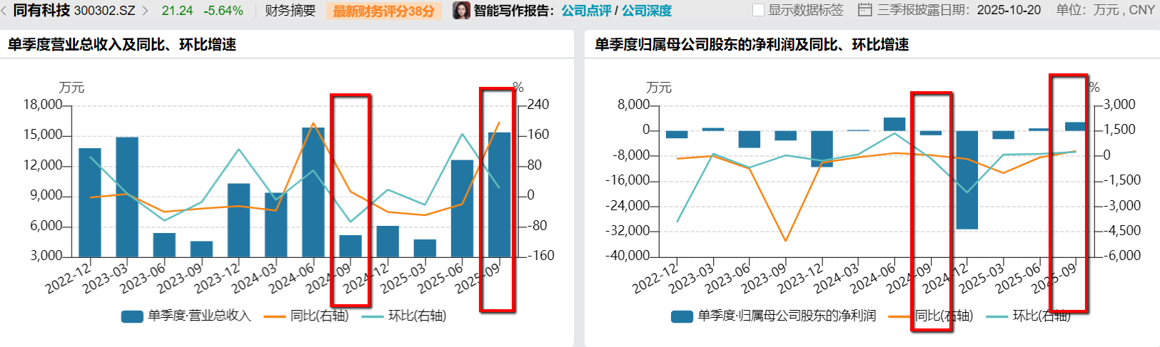 炒股第一步,先开个股票账户 同有科技(300302.SZ)呈现显著业绩反转。前三季度,公司归母净利润实现扭亏为盈。其中,第三季度单季营业收入同比暴增197.06%,净利润飙升300.46%,得益于高端新品推广“成效显著”,利润端大幅改善,毛利率持续提升至52.34%。 对于这份亮眼的三季报成绩单,市场反应耐人寻味。10月20日,同有科技股价高开7.51%,但旋即遭遇抛压股价一路震荡下行,最终走出了一根“高开低走”阴线,收盘下跌5.51%,报收21.27元/股。 这份看似无可挑剔的成绩单,为何未能换来持续的涨势?亮眼的单季度数据背后,隐藏着哪些玄机与风险? 双面三季报 界面新闻记者拆解同有科技三季报发现,“单季度”与“累计值”之间存巨大反差。 ![]() 第三季度,同有科技实现营业收入1.54亿元,同比增长197.06%,环比增长21.68%;归属于上市公司股东的净利润2766.83万元,同比增长300.46%,环比增长248.54%。这样的数据足以让投资者眼前一亮。公司将其归功于“全线发布PCIe5.0高端新品后,产品竞争力得到大幅加强”,并成功中标“数个千万级项目”。此外,同有科技也表示,“高端新品实现收入相比去年全年大幅增长,自主可控产品技术实力得到用户的充分验证和认可。”随着自主可控存储产品在用户高端核心业务应用场景的市场覆盖率有效提升,公司1-9月的综合毛利率达到52.34%,同比提升4.41个百分点,显示其产品结构优化和成本控制初见成效。 今年1-9月,同有科技营业收入实现3.27亿元,同比仅增长7.73%。这意味着,前三季度的大部分增长是由第三季度贡献的,前两个季度公司业务表现平平,归属于上市公司股东的净利润为928.78万元,同比大幅下滑70.37%;扣非净利润为875.79万元,同比下滑71.20%。 “这个数据对比非常鲜明,说明公司业绩的季度波动性较大。” 资深电子行业投资人徐新毅对界面新闻记者表示,“第三季度的爆发,更像是对上半年业绩不佳的一种‘补偿’,可持续性需要打一个问号。投资者担心,这是否只是项目确认收入的周期性波动,而非趋势性的反转。” “变”与“不变” 相较于半年报,同有科技三季报揭示了一些积极的变化,但也有一些深层次的隐患。 核心变化在于盈利能力的逆转以及现金流改善。半年报时,同有科技净利润处于同比大幅下滑状态,约亏损1838万元。三季报凭借单季的出色表现,将累计净利润扭亏为盈。另外,三季报显示公司经营活动产生的现金流量净额为-2,440万元,虽然仍为负值,但相比上年同期的-9,751万元,改善了74.98%。说明销售回款和采购付款管理有所优化。 然而,隐患也不可忽视。 ![]() 数据来源:三季报 首先,投资收益变成了同有科技的“拖油瓶”。报告显示,公司1-9月投资收益为-915.44万元,同比暴跌174.99%。主要原因是参股公司忆恒创源和泽石科技带来的投资损失。忆恒创源虽三季度单季盈利,但因上半年计提大额存货减值,累计仍亏损,;泽石科技则处于研发投入期,后续还将大规模投入,短期内想解决亏损难度不小。同有科技也承认,若剔除这部分影响,存储业务净利润可达1,851.34万元。 其次,财务费用高企需要重视。前三季度,同有科技财务费用高达1248万元,同比增长104.53%。主要原因是长沙存储产业园在建工程转固后,项目贷款利息停止资本化,直接计入了费用。这暴露出公司负债压力沉重,利息支出将持续侵蚀利润。 最后,资产质量与流动性压力值得重视。前三季度同有科技应收账款增至3.74亿元,信用减值损失达-462万元,同比增长217.83%,坏账风险积聚。同时,短期借款高达2.74亿元,一年内到期的非流动负债激增259.62%至6521万元,而货币资金仅1.17亿元,偿债压力不言而喻。 “同有科技正处于一个艰难的转型期。” 介于上述情况,某私募基金分析师王宇晨对界面新闻记者表示,“它押注自主可控和高端存储的战略方向是对的,PCIe5.0产品也确实带来了业绩弹性。但公司同时要消化新园区转固的折旧与财务压力,还要忍受参股公司带来的业绩波动,好比一个人想全力奔跑,脚上却戴着镣铐。”或许只有在这些隐忧得以改善的前提下,公司基本面、市场认可度才能真正迎来反转。 高毛利神话能否延续? 9月,同有科技股价累计上涨37.2%,远超计算机设备板块12.5%的平均涨幅,显著跑赢创业板指同期涨幅8.21%。9月国产存储替代政策密集出台,《数据要素市场三年行动计划》明确“2025年核心存储设备国产化率超60%”目标,同有科技作为国家队供应商,参与多个国家级数据中心项目,市场猜测其将直接受益于《数据要素市场三年行动计划》。 ![]() 徐新毅表示,“A股市场常有‘利好出尽是利空’的效应。9月的上涨已经很大程度上透支了三季报的利好。当这份‘惊艳’的财报真正摆在投资者面前时,前期潜伏的资金恰好找到了完美的获利了结时机,这就造成了财报日‘高开低走’的经典走势。” 这份三季报中,同有科技的高毛利让投资者惊喜,但52.34%的毛利率是否具备持续性呢? ![]() 数据来源:三季报 同有科技强调,毛利率提升至52.34%是因为"高端新品竞争力增强"。但这一数据背后,隐藏着行业竞争加剧的隐忧。PCIe5.0 作为当前存储行业的技术热点,已吸引华为、浪潮、曙光等巨头纷纷布局。同有科技虽率先推出相关产品,但在品牌影响力和渠道覆盖上并不占优。"目前 PCIe5.0存储系统的市场渗透率不足10%,主要应用于 AI、超算等高端场景。" 徐新毅表示,“同有科技不仅面临与