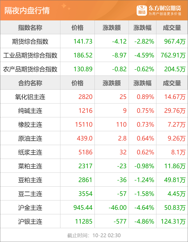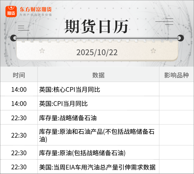 隔夜行情![]() ![]() 每日精选深夜暴跌!黄金急速跳水 发生了什么? 特朗普称将于明年初访问中国 外交部回应 俄乌突发!多名欧洲领导人联合声明 支持俄罗斯与乌克兰立即停火 宏观产经中国新闻网:有记者向外交部发言人郭嘉昆提问称,美国总统特朗普周一再次就台湾问题发表言论,并表示对与中方领导人的关系充满信心。特朗普还表示,他将于明年初访问中国。外交部对特朗普的上述言论有何回应?对此,发言人郭嘉昆表示,中方在台湾问题上的立场是一贯的、明确的,台湾是中国领土不可分割的一部分,台湾问题纯属中国内政。此外郭嘉昆强调,元首外交对中美关系发挥着不可替代的战略引领作用,中美两国元首保持着密切的沟通与交往。 商务部:10月20日,商务部副部长凌激主持召开外资企业圆桌会,170余家外资企业及外国商协会代表参会。凌激表示,“十四五”前四年,中国GDP增速平均为5.5%,在复杂严峻的外部环境下,中国经济展现出强大韧性和巨大潜力,并充满活力,为外资企业带来广阔机遇和良好预期。 财联社:据媒体报道,在贵州省内近期已经有超十家银行机构发布公告取消通知存款自动转存业务。此外,近期北京银行也在官网发文,自10月起新办理的单位通知存款,原则上挂钩北京银行挂牌利率。在业内人士看来,此举是为了响应监管部门关于落实通知存款、协定存款利率自律要求的结果。客观上有利于银行进一步降低负债,并驱使部分客户的存款向银行理财、黄金投资等方向转化。 品种资讯黑色系期货 钢材:中天钢铁集团出台2025年10月下旬建材价格调整:螺纹钢品种价格下调50元/吨,高线品种价格下调50元/吨 ,盘螺品种价格下调50元/吨。沙钢出台2025年10月下旬建材价格调整:螺纹钢价格暂稳,高线价格暂稳,盘螺价格暂稳。执行日期自2025年10月21日起。 海关总署数据显示:2025年9月国内钢坯出口总量共计149.36万吨,月环比减少15.34%,年同比增加41.85%。其中普方坯占比55.67%,普板坯占比10.89%。(财联社) 焦煤:2025年9月,进口炼焦煤总量达到1092.36万吨,环比上涨7.49%。环比增长主要受国内炼焦煤价格反弹驱动,进口买盘增加,以及关键口岸通关效率提升的影响。四季度炼焦煤进口量环比三季度小幅下滑。主要进口增量预计仍旧来自蒙古国,为保证达成全年供货量目标,预计四季度进口量会持续发力。整体而言,四季度炼焦煤进口虽有个别国家预期增加,但难掩整体下滑趋势,全年进口总量有望突破1.1亿吨。(财联社) 铁矿石:10月21日,Mysteel统计中国47港进口铁矿石港口库存总量15065.28万吨,较上周一增340.14万吨;45港进口铁矿石港口库存总量14368.88万吨,环比增282.74万吨。 10月13日-19日期间,澳大利亚、巴西七个主要港口铁矿石库存总量1173.0万吨,环比下降116.7万吨,呈现加速去库态势,库存水平创下半年新低。(我的钢铁网) 农产品期货 豆粕:10月17日,全国主要油厂进口大豆库存812万吨,周环比基本持平,月环比上升59万吨,同比上升149万吨,较过去三年均值上升348万吨;豆粕库存96万吨,周环比下降11万吨,月环比下降28万吨,同比基本持平,较过去三年同期均值上升29万吨。(国家粮油信息中心) 棕榈油:据马来西亚独立检验机构AmSpec,马来西亚10月1日-20日棕榈油出口量为965066吨,较前一月同期出口的941984吨增加2.5%。 南部半岛棕榈油压榨商协会(SPPOMA)数据显示,2025年10月1日-20日马来西亚棕榈油单产环比前一月同期增加1.45%,出油率环比前一月同期增加0.24%,产量环比前一月同期增加2.71%。(新华财经) 白糖:10月21日,我国以进口巴西原糖为原料生产的白糖其销售利润约为1771元/吨(关税配额内,15%关税)或6929元/吨(关税配额外,50%关税);我国以进口泰国原糖为原料生产的白糖其销售利润约1686元/吨(关税配额内,15%关税)或518元/吨(关税配额外,50%关税)。(我的钢铁网) 有色/贵金属期货 沪金:现货黄金从北京时间周二15时后开始一波显著跳水,日内从每盎司4381美元的历史高点回落至4220美元。虽然没有明确的驱动事件,但历史新高位置的获利盘抛压、地缘局势出现缓和迹象、印度季节性购买结束,以及美元走强都对金价形成牵制。(财联社) 沪铜:10月21日,必和必拓发布2025财年第一季度(截至2025年9月30日)运营公报。该季度公司铁矿石产量铁矿石产量下降1%至6400万吨,平均实现价格为84.04美元/湿吨,同比上涨5%;铜产量增长4%至49.4万吨,平均实现价格为4.59美元/磅,同比上涨8%。炼钢用煤产量同比增长8%至490万吨,动力煤产量则下降4%至350万吨。必和必拓表示有望实现全年业绩指引。(界面新闻) 碳酸锂:10月21日,上海钢联发布的数据显示,电池级碳酸锂(早盘)价格与上日持平,均价报76250元/吨。(每日经济新闻) 多晶硅:据上海有色网,市场N型18X硅片价格1.35元/片,N型210RN硅片价格1.4元/片。上周协会开会后,硅片在原材料再度暴涨的预期下,硅片也转向涨价预期,210N首当其冲。10月硅片排产增量相对明显,头部企业开工率不减反增,部分专业化厂也有提产计划。整体Q4根据协会配额,11-12月硅片企业基本确定减产。硅片库存近期内部转移情况明显,下游原料库存向上游成品库存规模转移,总量呈小幅累库的趋势。目前总库存处于合理水位以下,企业平稳出货。(南方财经网) 能化期货 原油:瑞银预计油价将在当前水平附近企稳。瑞银同时也指出,尽管这并非其基本预测情形,但若贸易紧张局势进一步升级,油价可能会面临下行压力