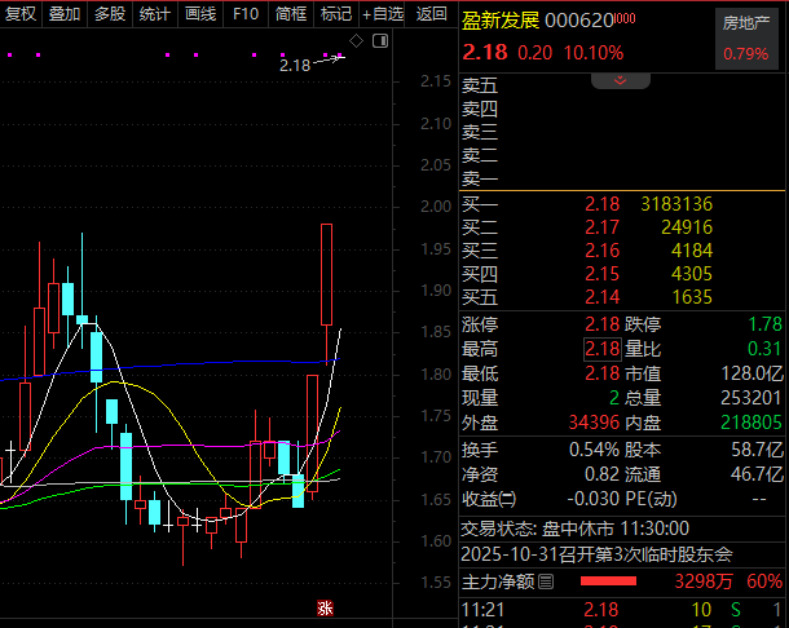回调不改科技股趋势机会。 今天(10月22日)早盘A股市场主要指数强势震荡。截至上午收盘,上证指数跌0.44%,创业板指跌0.89%。盘面上看,本轮科技牛龙头“易中天”早盘一度集体上涨,天孚通信一度大涨近10%,中际旭创一度大涨近4%,股价创出历史新高,新易盛一度涨超2%。 赚钱效应依旧可观,30多只个股涨停,其中盈新发展(000620)在突发利好下早盘巨量涨停,集合竞价后封单一度超过500万手。 突发利好,000620涨停 10月21日晚间,盈新发展发布公告称,公司与广东长兴信息管理咨询有限公司、张治强签署了《股权收购意向协议》,计划以支付现金方式收购其合计持有的长兴半导体81.8091%股权。本次交易完成后,公司预计将实现对长兴半导体控股。 资料显示,长兴半导体成立于2012年11月,是一家专注于存储器芯片封装测试和存储模组制造的高新技术企业。 该公司形成了研发封装测试一体化的经营模式,拥有晶圆测试和修复技术,具备8层叠Die封装工艺以及BGA、SiP、CSP等封装技术,可生产消费级NAND FLASH模组和DRAM内存模组。该公司拥有76项有效专利授权,其中发明授权22项、实用新型54项,为国家级高新技术企业、国家级专精特新“小巨人”企业、广东省大容量闪存芯片封装及测试工程技术研究中心依托单位。 在此利好消息影响下,今天早盘盈新发展开盘涨停,集合竞价后封单一度超过500万手。截至上午收盘,该股报2.18元/股,上涨10.1%,封单超过318万手。值得一提的是,该股此前已经连续两个涨停板。 ![]() 中际旭创创历史新高 光模块指数近期持续反弹,今天早盘一度上涨近1%。个股方面,龙头中际旭创一度大涨近4%,股价创出历史新高,市值一度重回5000亿元大关。天孚通信上午收盘大涨近7%。