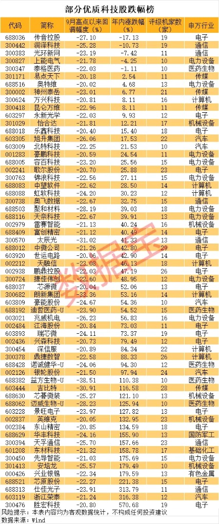 超跌优质科技股曝光 短线超跌优质科技股未来能否反弹?据证券时报·数据宝统计,10家及以上机构评级的科技题材股中,有60多只个股最新价较9月高点以来回调超20%。从题材分布来看,上榜个股主要集中在AI题材、新能源、医药、机器人等。比如AI板块的鹏鼎控股、鼎捷数智、英维克等;新能源的聚和材料、先导智能、容百科技等;医药行业的迪哲医药-U、泰格医药等;机器人题材的怡合达、雷赛智能、兆威机电等。 部分个股的回调有前期涨幅较大的原因。比如益方生物-U本轮回调近39%,年内涨幅依然超过110%;另外吉比特、迈威生物-U等回调股年内涨幅超过100%。不过,也有些个股年内股价逆市下跌,比如传音控股、润泽科技、光环新网等。 ![]()