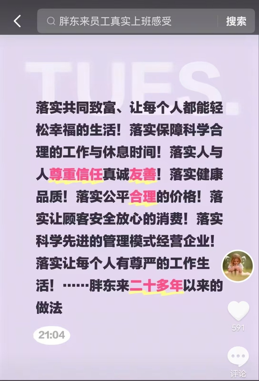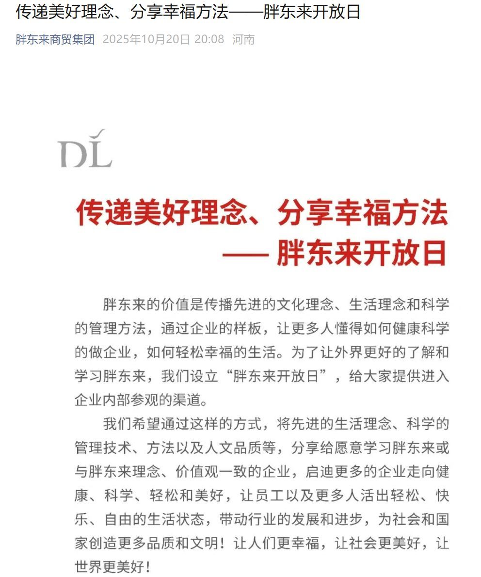10月21日,于东来在社媒连续发文。于东来称:“为了方便企业家学习、正在规划方案!哪个企业家想让我个人直接分享交流、时间安排三个小时左右、每次五十万元费用!每月最多一次!费用全部用于传播美好之路!” 于东来表示“正在规划明年由联商学院组织收十个以内的企业家到胖东来学习、每年二到三次、两天的交流活动!每人费用100万元!收入费用全部用于传播美好之路!” 于东来称:“还会有免费的,我在网上与大家直播分享交流。” ![]() ![]() ![]() ![]() 图片来源:于东来抖音账号 值得注意的是,10月20日,胖东来发文称,为了让外界更好的了解和学习胖东来,将设立“胖东来开放日”,给大家提供进入企业内部参观的渠道。 胖东来开放日时间为2025年11月1日起的每月10日、20日,开放对象为企业级学习参访,参访范围为产业园、天使城、时代广场,参访人数方面,每批次不超过15人,同一企业最多可预约5人,收费标准为每人20000元。 想要获得这一学习机会,企业需要通过线上预约和资质审核。预约通道定于每月1日和11日上午10点开启。 胖东来方面将对报名企业进行审核,并在审核通过后进行电话沟通、签署合同及缴费。为保证机会的公平性,规定每人每年仅有一次参访机会。 ![]() 10月14日,胖东来创始人于东来在个人账号上分享相关内容时介绍,目前公司没有贷款,账上资金达41亿元。 ![]() 图片来源:于东来个人账号 根据胖东来官网数据,2025年,该公司合计销售额已超过184亿元,10月合计销售额突破11亿元。其中,国庆假期八天合计销售额8.2亿元。 今年3月28日,胖东来创始人于东来曾表示,要控制销售规模,“今年我们规划的销售要在200亿以内,尽量控制在200亿以内。”他认为,销售额如果上升得太快,员工就得加班,承担更多的压力,这样不免对企业最初的价值观产生影响。