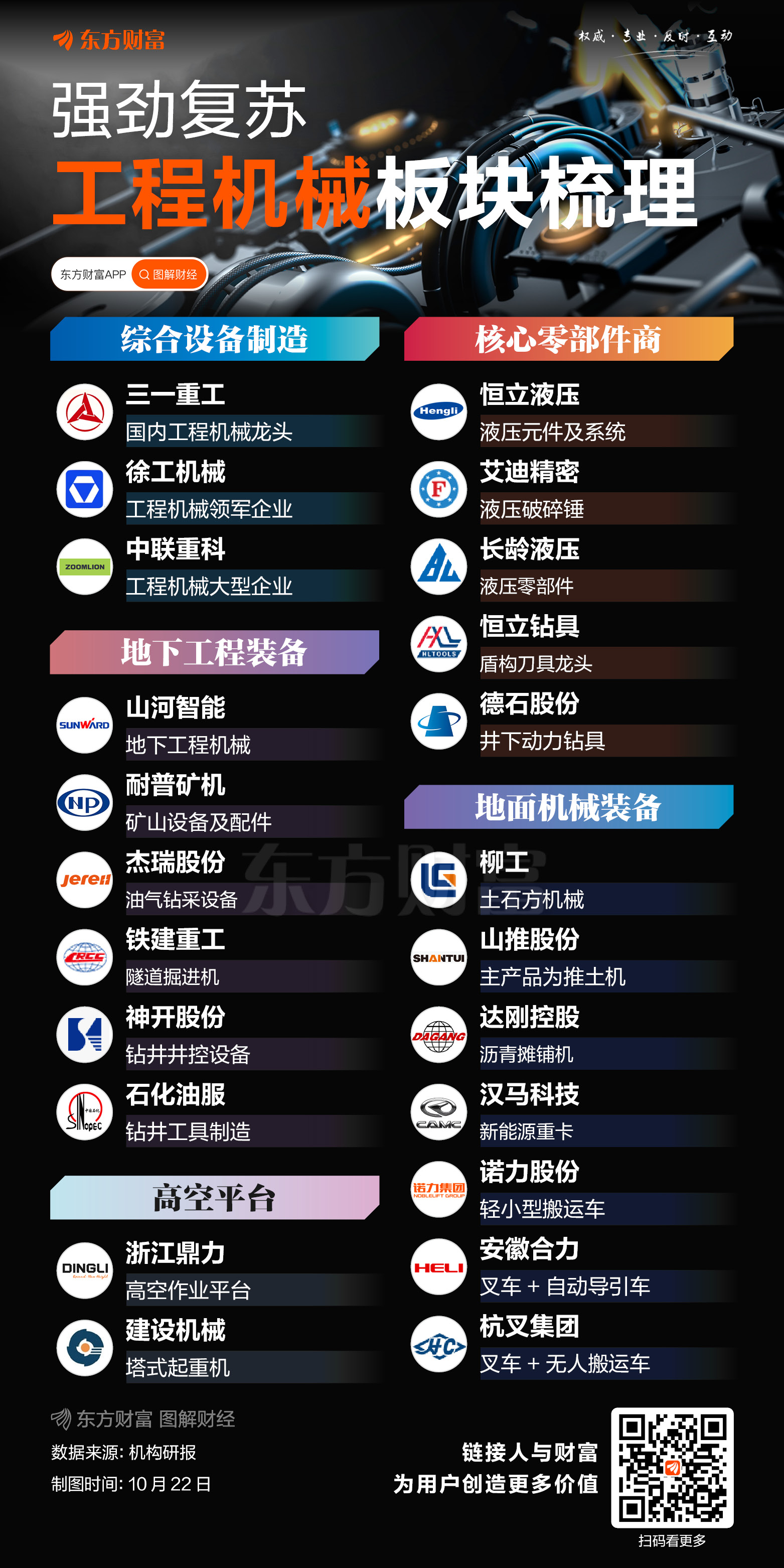 强劲复苏!一图梳理工程机械板块 在丁冬财经看资讯行情,选丁冬财经证券一站式开户交易>> ![]() 周三工程机械板块逆势收涨超2%,个股方面,德石股份大涨近17%,石化油服、神开股份、建设机械等涨停,山河智能、五新隧装涨超6%,徐工机械、三一重工、中联重科等跟涨。 据证券时报,今年以来我国工程机械行业呈现强劲复苏态势。中国工程机械工业协会根据海关数据整理显示,2025年9月我国工程机械进出口贸易额为55.05亿美元,同比增长29.1%,其中进口额为2.34亿美元,同比增长18.5%;出口额为52.71亿美元,同比增长29.6%,成为推动行业增长的主要动力。 今年前三季度累计数据同样亮眼,工程机械进出口贸易额累计为458.73亿美元,同比增长12.8%。其中进口金额为20.17亿美元,同比增长3.81%;出口金额为438.55亿美元,同比增长13.3%。 9月工程机械行业各产品品类销售数据普遍呈现回升态势。其中,作为基础设施建设“晴雨表”的挖掘机表现尤为突出。据中国工程机械工业协会对挖掘机主要制造企业的统计数据,9月销售各类挖掘机19858台,同比增长25.4%,其中国内销量9249台,同比增长21.5%;出口量10609台,同比增长29%。 浙商证券认为,工程机械海外市占率提升,国内更新周期逐步启动。考虑到我国工程机械主机厂海外市占率提升,“一带一路”共建国家城镇化与工业化推进带来的基建和地产需求增长等因素影响,我国工程机械出口正增长趋势有望延续。国内周期筑底上行主要受益于农林、市政需求驱动小微挖需求增长,我国主机厂在矿山机械领域持续突破及水利需求带来的大挖及超大挖需求,以及国内更新需求逐步启动等因素。