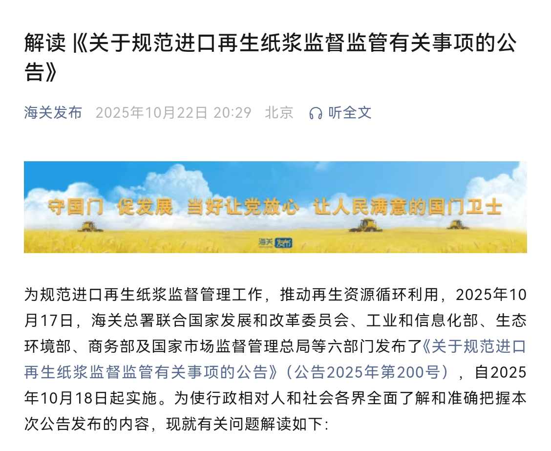 规范进口再生纸浆监督监管 海关总署三解读 全新妙想投研助理,立即体验 据微信公号“海关发布”消息,海关总署今(10月22日)晚就日前发布的《关于规范进口再生纸浆监督监管有关事项的公告》 进行解读,以使行政相对人和社会各界全面了解和准确把握本公告发布的内容。 为规范进口再生纸浆监督管理工作,推动再生资源循环利用,2025年10月17日,海关总署联合国家发展和改革委员会、工业和信息化部、生态环境部、商务部及国家市场监督管理总局等六部门发布了《关于规范进口再生纸浆监督监管有关事项的公告》,自2025年10月18日起实施。 该公告明确,进口再生纸浆的境外生产原料,须为分类回收的纸、纸板及纸制品。进口再生纸浆须符合GB/T 43393国家标准要求。进口再生纸浆生产、经营企业应严格落实产品质量安全主体责任,坚持依法诚信经营,自觉履行社会责任,强化原料、生产、加工、仓储、运输等全要素全链条管理,维护我国生态安全和生物安全。行业协会应加强行业指导,建立企业诚信档案,严格行业内部管理,加强行业自律,促进行业健康发展。 公告以附件的形式明确再生纸浆的关键指标要求,海关对进口再生纸浆开展感官检验,并按照海关技术规范对附件中的关键指标进行检验。海关发现进口再生纸浆疑似固体废物的,可以委托专业机构开展属性鉴别。经鉴别为固体废物的,依法实施退运处理;对违反相关法律法规的,依法追究法律责任。海关对进口再生纸浆实施风险监测和风险评估,动态调整检验监测指标。政府有关主管部门依职责对进口再生纸浆加强监管,强化信息沟通和协同配合,形成工作合力。 ![]() 就企业如何对进口再生纸浆实施产品质量把控问题,海关总署表示,企业应严格落实产品质量安全主体责任,强化再生纸浆原料的源头和生产工艺流程管理,严格产品质量自检,坚持依法诚信经营,自觉遵守法律法规和公告的相关要求,确保进口的再生纸浆符合GB/T 43393国家标准要求。 例如,使用过的餐巾纸、卫生纸、纸杯等生活类废纸,均不属于公告明确要求的“分类回收的纸、纸板及纸制品”,不能将其作为生产进口再生纸浆的原料。 就进口再生纸浆在什么情况下会被退运、被鉴别为固体废物会怎样处置等问题,海关总署表示,按照海关技术规范对公告附件中的关键指标进行检验,对检验不合格的进口再生纸浆,实施退运或销毁处理。对经鉴别为固体废物的,将依法实施退运。如企业有违反法律法规的情形,还将被追究相关法律责任。 例如,进口再生纸浆中的金属、塑料、玻璃等夹杂物含量超过公告0.50%的限值要求,将被退运或销毁;若夹杂物含量超标过多,可能被鉴别为固体废物。再如,仅经过简单分类、剪切、打包等处理的废纸碎片,仍属于禁止进口的固体废物。 就进口再生纸浆在申报时有什么注意事项的问题,海关总署表示,进口再生纸浆的海关商品编号为4706200000,依据海关总署公告2025年第195号,进口货物收货人或者其代理人在申报进口再生纸浆时,应在报关单备注栏注明生产再生纸浆使用的工艺方法,根据实际情况填写为“干法”或“湿法”。为便于企业申报和口岸检查,海关提醒企业不同工艺方法生产的再生纸浆不能混装。 (文章来源:第一财经) |