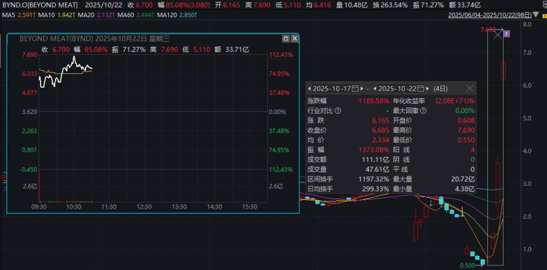 人造肉第一股Beyond Meat(BYND.US)的狂飙行情仍在继续。 周三美股开盘后,Beyond Meat股价一度因为涨幅过大而多次暂停交易。截至记者发稿,公司股价上涨超80%。在最近4个交易日,公司股价涨幅接近12倍。 ![]() 值得注意的是,上周前4个交易日(10月13日——10月16日),Beyond Meat因多数债权人接受债务交换计划、导致股东权益大幅稀释而重挫,公司股价累计暴跌超74%,最低至0.5美元。 但随着著名散户论坛Reddit上有大V公开看好公司前景,公司股价开始出现异动。一名名为Demitri Semenikhin 的交易者近期在社群媒体上大力吹捧该股,引发散户跟进。Semenikhin上周在Reddit上发帖表示,他已经购买了大约20 分之一的现有股票。他在周日晚上的一则视频中进一步阐述了他的看涨论点。 “Beyond Meat以每股近3美元的价格向新投资者出售股票,并用这笔钱偿还债务。此举对 Beyond来说是利好,消除了之前的高破产风险,并大大加强了其资产负债表。”他在视频中解释道。 随后,机构的关注让公司的股价继续上涨。 投资公司 Roundhill Investments 周一晚间在社交媒体宣布,已将Beyond Meat纳入其“迷因股ETF”成份股,进一步助长市场炒作情绪。该ETF追踪一系列散户最喜欢的股票,其中Beyond Meat的股权最大,约为10.2%。 本周二(10月21日),Beyond Meat又公布了产品在沃尔玛门市的销售点扩增至逾2000家的消息,推升股价再度冲高。Beyond Meat称,包括“Beyond汉堡6片装”和“Beyond鸡柳”在内的部分产品将在全美2000家沃尔玛门店销售。 当天,该股成交金额达59亿美元,相当于公司市值的4.2倍,股价涨幅146%。上周四,Beyond Meat的市值不到4000万美元,但在连续急涨后,估值迅速膨胀到超过20亿美元。 根据Vanda Research的数据,散户周二购买了价值近3500万美元的Beyond Meat股票,这是有记录以来最大的单日购买量。 也有分析师指出,此波涨势可能是空头回补 (Short Squeeze) 所带动。根据分析公司Ortex的数据,Beyond Meat的空头股数约为其自由流通量的81.8%,是市场上做空最多的股票之一。这比上周的约64%有所上升。 “Beyond Meat股票的一系列异常似乎更多地与空头挤压有关,而不是投资者对该股兴趣的任何真正转变。”AJ Bell财务分析主管Danni Hewson说。 “亏损、严重做空,这是典型的MEME股上涨模式。”德国数据集团Breakout Point的董事总经理Ivan Cosovic说。 所谓的MEME股,又称网红股、美国散户抱团股,是2020年新冠疫情期间出现的金融现象,指通过Reddit等社交媒体平台引发散户投资者群体性买入、对抗机构做空的股票,其股价往往因网络热度出现短期剧烈波动。 “很多人在讨论这家公司,但和它的主营业务——人造肉没什么关系。散户们只是又有了新的谈资,找到了MEME的乐趣。”Ivan Cosovic说。除了Reddit,WallStreetBets和stocktwits等论坛上的投资者也在讨论这只股票。 Beyond Meat于2019年登陆美股市场,曾在上市初期掀起狂热,股价一度高达239美元。如今股价虽远低于当年高点,但仍吸引散户炒作关注。 从基本面上看,Beyond Meat的业绩并无转好迹象。该公司自2020年一季度后从未有过盈利记录。分析师对于公司前景也不乐观。LSEG数据显示,覆盖Beyond Meat的8名分析师中,有5名给予“卖出”或“强烈建议卖出”评级,3名建议“持有”,目标股价中值为每股2.42美元。 除了Beyond Meat外,另外一只MEME股Krispy Kreme的股价在周三上涨29%。