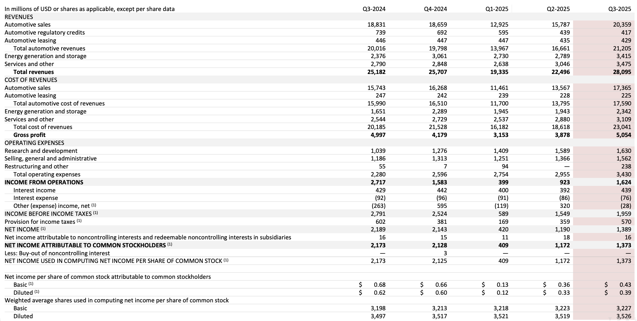 全新妙想投研助理,立即体验 特斯拉三季度营收反弹,但净利润继续下滑。 北京时间10月23日,特斯拉发布的2025年第三季度业绩显示,公司第三季度营收280.95亿美元,创下季度营收新高,同比增长11.57%,超出华尔街预期。 营收增长主要得益于新车交付量的提振。今年第三季度,特斯拉交付量创历史新高。交付量达49.7万辆,同比增长7.4%,刷新了季度交付纪录,大幅高于分析师预期的44.8万辆。 得益于美国消费者在政府的购买电动车税收抵免政策到期前抢购,特斯拉三季度的营收超预期大反弹。在美国市场,高达7500美元的联邦政府补贴于9月30日到期结束,消费者在政策结束前纷纷购买电动汽车。 此外,财报称,储能业务的大幅增长也是其营收大涨的重要原因。特斯拉第三季度储能产品装机量达到12.5GWh(吉瓦时),再创历史新高。 需要指出的是,特斯拉第三季度的一次性智能辅助驾驶套件FSD收入确认同比下降。 ![]() 但增收不增利,特斯拉第三季度经营利润16.24亿美元,略低于市场预期,同比下滑40.23%;净利润为13.73亿美元,同比下跌36.81%;调整后每股收益为0.39美元,去年同期为0.62美元,同比下滑37.1%。这是特斯拉净利润连续第三个季度下滑。毛利率为18%,上年同期为19.8%,第二季度为17.2%。 ![]() 特斯拉方面称,这主要是由销售、一般行政费用、人工智能等研发项目推动的运营费用增加,股票薪酬(SBC)等费用增加,一次性全自动驾驶(FSD)收入确认同比下降等原因导致。 产品方面,财报介绍,Cybercab、特斯拉半挂式电动卡车(Tesla Semi)和储能单元Megapack 3均按计划将于2026年开始量产,为迎接量产,人形机器人擎天柱(Optimus)的第一代生产线正在建设中。 特斯拉在财报中称,全球贸易政策的调整对汽车及能源供应链、成本结构以及耐用品和相关服务需求的影响。公司将持续发展并扩充产品线,聚焦成本、规模以及人工智能服务等。 周三美股收盘,特斯拉跌0.82%,报收于438.97美元/股;截至发稿,特斯拉盘后跌近4%。 (文章来源:澎湃新闻) |