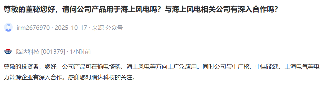 腾达科技23日在互动平台上回答投资者提问时表示,公司产品可在输电塔架、海上风电等方向上广泛应用。同时公司与中广核、中国能建、上海电气等电力能源企业有深入合作。