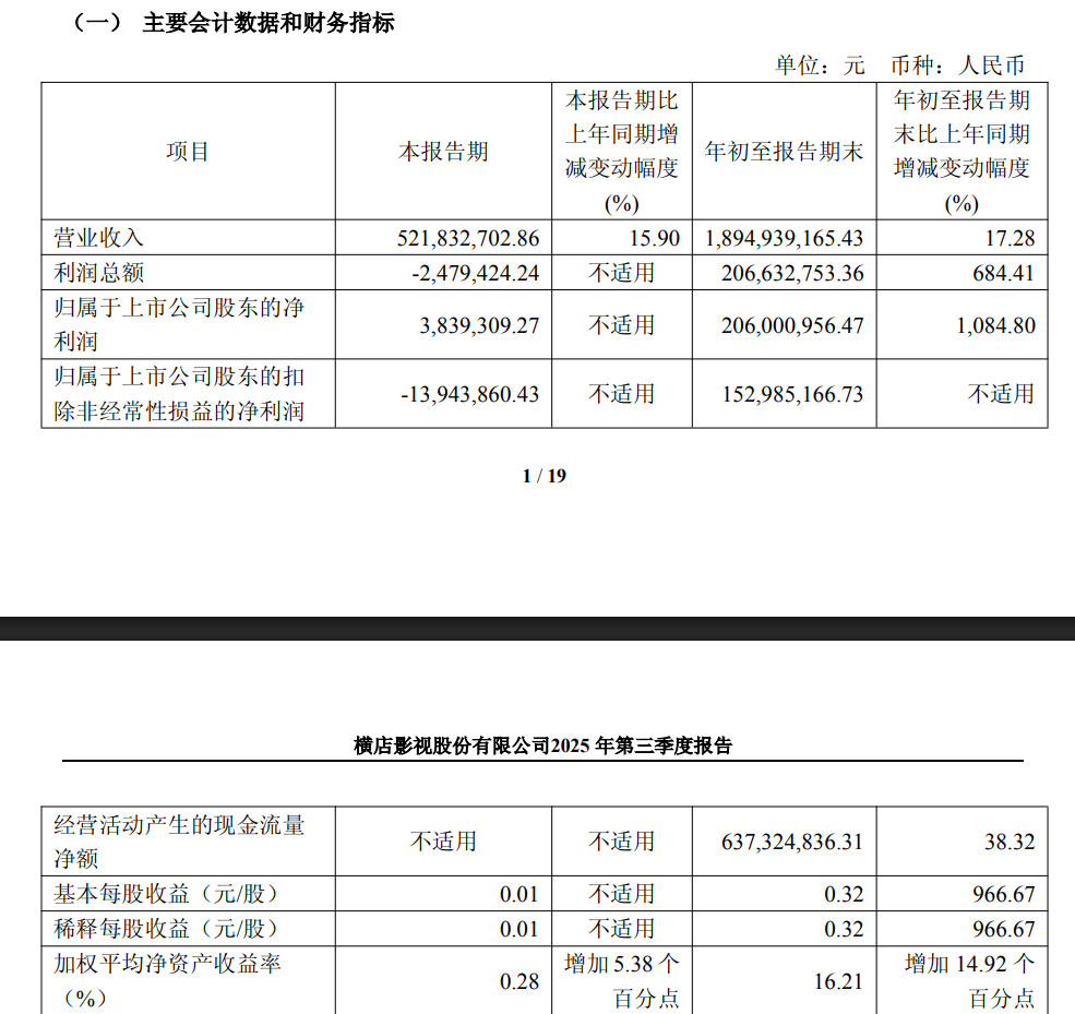 横店影视前三季度净利润增超10倍,拟拿出四成净利润用于现金分红。 10月22日,横店影视股份有限公司(横店影视,603103.SH)披露2025年第三季度报告,前三季度公司实现营业收入18.95亿元,同比增长17.28%;归母净利润2.06亿元,同比增长1084.80%。对于业绩增长,三季报解释称主要系电影放映及相关衍生业务利润增加所致。 其中,第三季度公司实现营业收入5.22亿元,同比增长15.90%;归母净利润383.93万元,同比扭亏为盈,上年同期净亏损7104.29万元。 ![]() 而从更能体现公司主营业务盈利能力的扣非净利润来看,横店影视第三季度扣非归母净利润为亏损1394.39万元。财报显示,非经常性损益项目下,第三季度公司非流动性资产处置损益高达693万元,计入当期损益的政府补助为187万元,此外,其他符合非经常性损益定义的损益项目金额高达816万元,上述三项损益合计近1700万元。 另据三季报,报告期末,横店影视经营活动产生的现金流量净额为6.37亿元,同比增长38.32%。公司总资产39.42亿元,相比上年度末的40.51亿元减少2.71%。 值得一提的是,横店影视拟拿出超四成净利润用于现金分红。公司披露的2025年前三季度利润分配预案显示,公司拟向全体股东每股派发现金红利0.14元(含税)。截至2025年9月30日,公司总股本6.34亿股,以此计算合计拟派发现金红利8878.8万元(含税),占2025年前三季度归属于上市公司股东净利润的比例43.10%。本次利润分配不送红股,不以公积金转增股本。该事项尚需提交公司2025年第二次临时股东会审议。 据Wind数据,横店影视自上市以来实施现金分红(含此次分红预案)共计5次,累计现金分红金额为4.90亿元。 公开资料显示,横店影视成立于2008年9月,主营影视投资、制作、发行、电影放映及相关衍生业务。2017年10月,在上海证券交易所上市。据三季报,公司第一大股东为横店集团控股有限公司,持股比例为80.35%。 从具体业务来看,电影放映及相关衍生业务方面,截至报告期末,公司下属院线共拥有528家影院,其中直营影院449家,银幕2867块;加盟影院79家,银幕438块。2025年1-9月,公司院线实现票房(不含服务费)16.21亿元,观影人次4569.31万;其中直营影院票房(不含服务费)14.51亿元,观影人次4109.90 万,票房市场占有率3.84%;加盟影院票房(不含服务费)1.70亿元,观影人次 459.41万,票房市场占有率0.45%。 此外,公司积极探索多元发展路径,解锁收入增长空间。报告期内,公司自营饮品“横店味道”结合热映影片推出一系列夏季新品,外卖等线上销售渠道已形成规模化。IP衍生品业务结合“玩具梦工厂”集合店与影院渠道优势,扩充合作品牌与商品类型,产品覆盖幼儿至成人全区段。 影视投资、制作及发行业务方面,截至报告期末,公司全资子公司浙江横店影业有限公司参与投资的《熊出没·重启未来》《射雕英雄传:侠之大者》《酱园弄·悬案》《恶意》《奇遇》《志愿军:浴血和平》《浪浪人生》等影片上映。 另外,全资子公司横店影视制作有限公司在原有电视剧、网络剧、网络电影制作、宣发等业务基础上,以短剧发展为新的增长点。截至报告期末,已设立“大横小竖”短剧品牌,多部短剧已在红果、番茄、爱奇艺等平台播出,同时积极引进海外短剧项目来横店合作拍摄,目前已与相关海外公司签约合作。 从电影市场整体表现来看,横店影视在三季报中援引拓普数据称,2025年第三季度全国电影市场总体平稳,延续较强的供需关系,全年票房提前锁定“同比增长”基调。2025年1-9月全国电影综合票房419.52亿元,观影人次9.85亿,同比分别增长21.13%和21.16%,其中国产影片票房占比为89.21%。7部影片票房破十亿,均为国产片。全国有营业数据的影院共1.34万家,同比增长 3.08%。2025年1-9月全国累计新建影院861家,较去年同期增加90家;累计新建银幕5140块,较去年同期增长455块。 截至10月22日收盘,横店影视报16.45元/股,涨5.92%,总市值104亿元;今年以来累计涨14.32%。