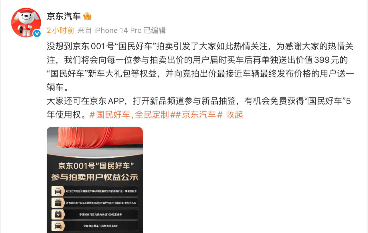 据悉,这辆001号“国民好车”起拍价1元,该车定价在10万至12万之间。值得注意的是,参与此次竞拍的用户需要交100元保证金。竞拍成功者,保证金可抵扣货款,放弃支付或支付后取消订单,将扣除保证金100元。 今日,京东汽车官方发布消息称:没想到京东001号“国民好车”拍卖引发了大家如此热情关注,为感谢大家的热情关注,我们将会向每一位参与拍卖出价的用户届时买车后再单独送出价值399元的“国民好车”新车大礼包等权益; 同时,并向竞拍出价最接近车辆最终发布价格的用户送一辆车。