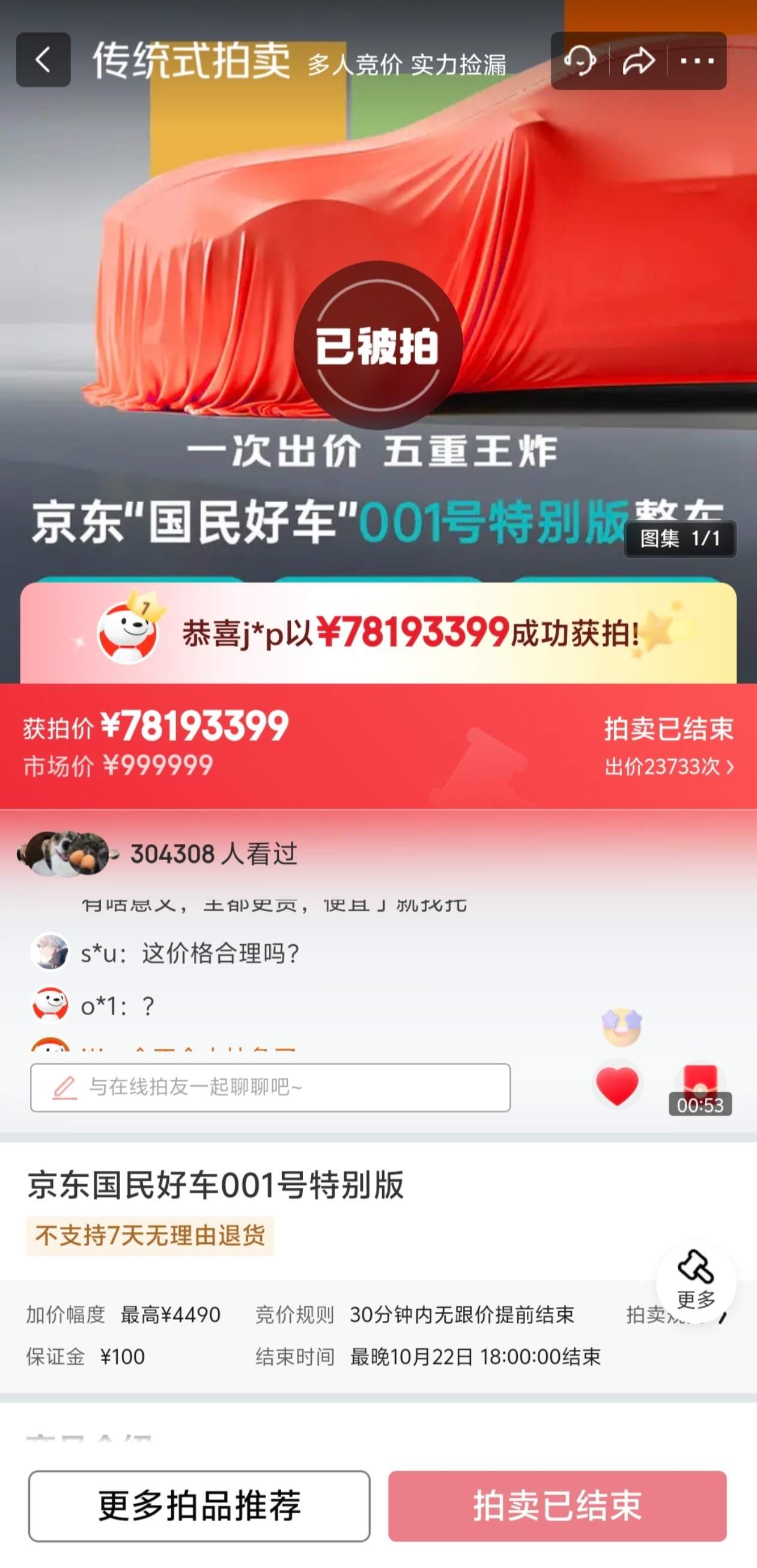 凤凰网科技讯 10月23日,从京东APP了解到,京东001号“国民好车”以7819.34万元的拍卖价格成交。