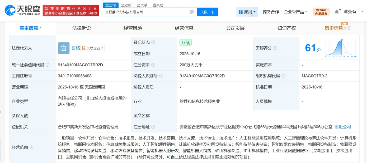 科大讯飞在合肥成立潮汐力科技公司 K 线图 特色数据 资金流向 公告 个股日历 核心题材 ![]() ![]() 最新价:51.75 涨跌额:0 涨跌幅:0.00% 成交量:31.7万手 成交额:16.2亿 换手率:1.45% 市盈率:-1345.66 总市值:1196亿 查询该股行情 实时资金流向 深度数据揭秘 进入科大讯飞吧 科大讯飞资金流 全新妙想投研助理,立即体验 天眼查工商信息显示,近日,合肥潮汐力科技有限公司成立,法定代表人为宫韬,注册资本200万人民币,经营范围含人工智能通用应用系统、人工智能理论与算法软件开发、计算机系统服务、物联网技术服务、信息系统集成服务、人工智能硬件销售、计算机软硬件及外围设备制造、智能仪器仪表制造等。股东信息显示,该公司由科大讯飞旗下浙江潮汐力科技有限公司全资持股。 ![]() (文章来源:南方财经网) |