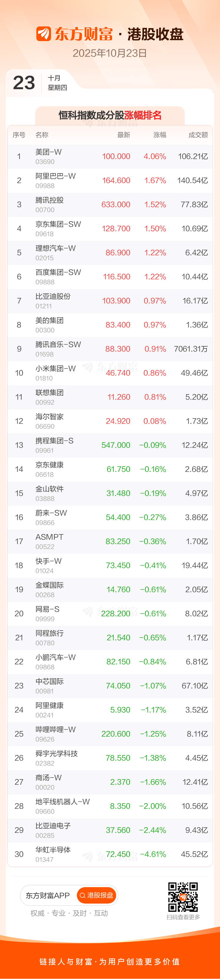 港股10月23日收盘走高,恒生指数收报25967.98点,涨186.21点,涨幅0.72%;恒生科技指数收报5951.45点,涨28.36点,涨幅0.48%。恒生指数成分股中李宁、中国宏桥、金沙中国有限公司涨幅居前,泡泡玛特、石药集团、中国生物制药跌幅靠前。恒生科技指数成分股中美团-W、阿里巴巴-W、腾讯控股涨幅居前,华虹半导体、比亚迪电子、地平线机器人-W跌幅靠前。