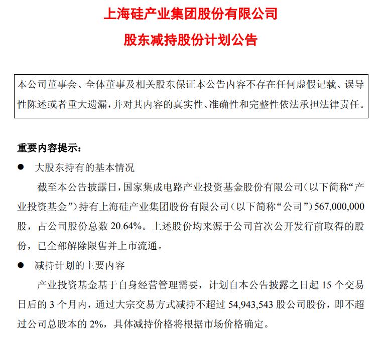 沪硅产业:国家集成电路产业投资基金计划减持不超2%公司股份 K 线图 特色数据 资金流向 公告 个股日历 核心题材 ![]() ![]() 最新价:24.11 涨跌额:-0.45 涨跌幅:-1.83% 成交量:32.8万手 成交额:7.84亿 换手率:1.20% 市盈率:-90.35 总市值:662亿 查询该股行情 实时资金流向 深度数据揭秘 进入沪硅产业吧 沪硅产业资金流 专业金融数据,下一代智能终端 10月23日,沪硅产业(688126.SH)公告称,股东国家集成电路产业投资基金股份有限公司持有公司5.67亿股,占总股本20.64%,计划自公告披露之日起15个交易日后的3个月内,通过大宗交易方式减持不超过5,494.35万股公司股份,即不超过公司总股本的2%,减持原因为自身经营管理需要。减持期间为2025年11月17日至2026年2月16日。 ![]()