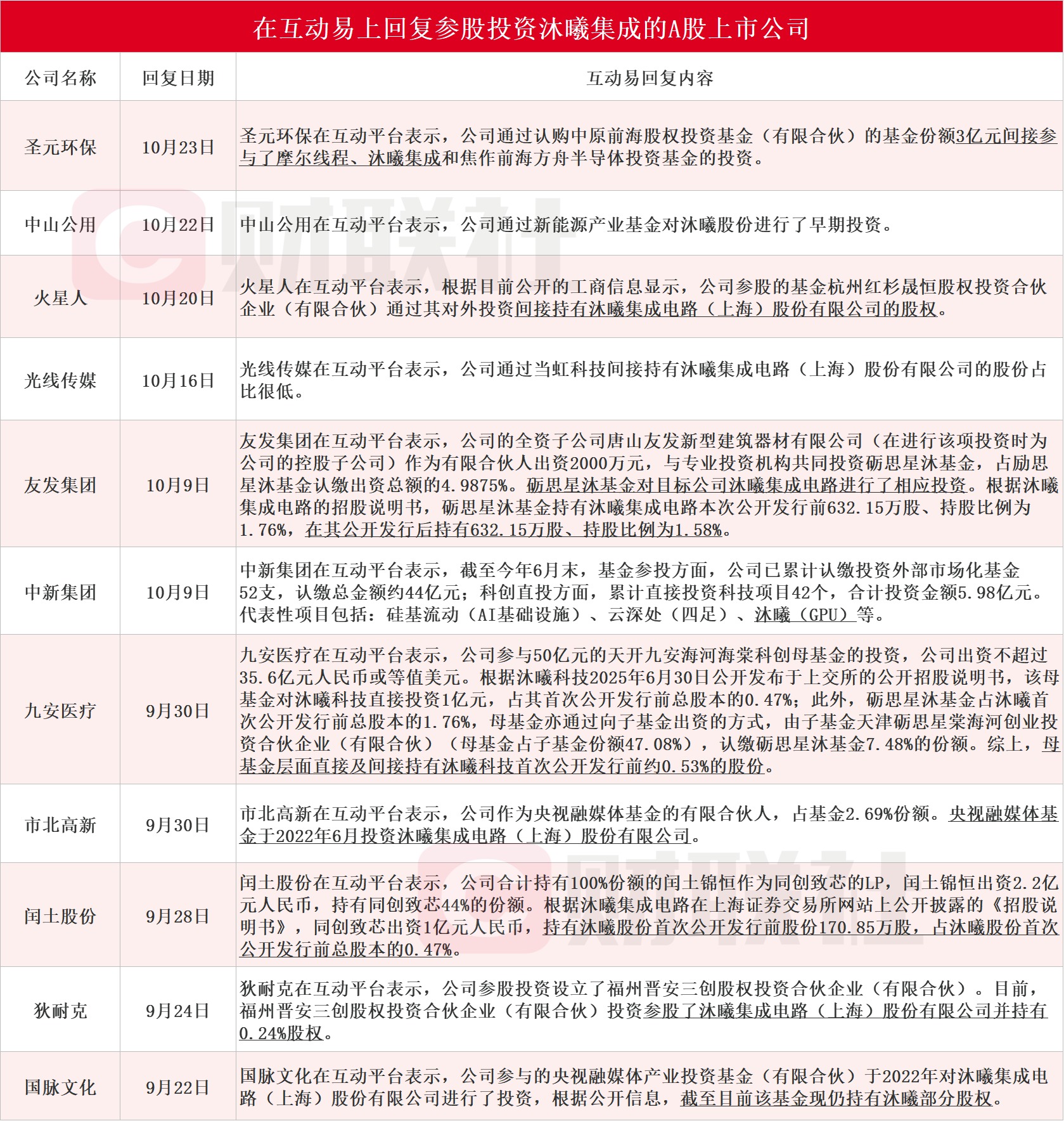 沐曦集成科创板IPO将于10月24日上会。据财联社不完全统计,圣元环保、中山公用、火星人、光线传媒、友发集团、中新集团、九安医疗、市北高新、闰土股份、狄耐克和国脉文化在内的11家A股上市公司在互动易上回复参股投资沐曦集成。其中,圣元环保今日在互动平台表示,公司通过认购中原前海股权投资基金(有限合伙)的基金份额3亿元间接参与了摩尔线程、沐曦集成和焦作前海方舟半导体投资基金的投资。