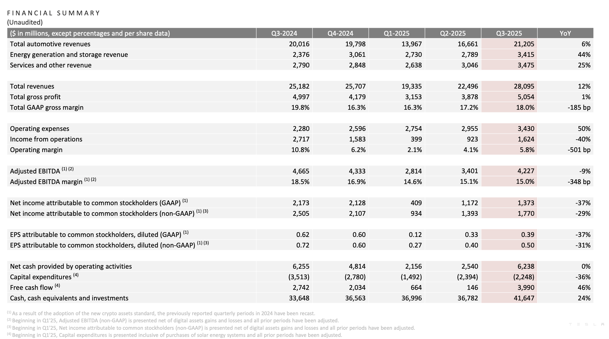 图片来源:特斯拉财报截图 特斯拉方面称,这主要是包括AI等研发项目在内的运营费用增加、股票薪酬(SBC)等费用增加、一次性全自动驾驶(FSD)收入同比下降等原因导致。 今年10月,特斯拉在美国发售了更低价的Model 3及Model Y标准版车型。其中,Model 3标准版起售价为36990美元,价格下降5000美元;Model Y标准版起售价为39990美元,比之前降低了5500美元。 与此同时,特斯拉并未在三季报中披露业绩指引,并表示在全球贸易与财政政策变化的背景下,汽车与能源供应链、成本结构及耐用消费品需求的影响难以量化。 “尽管贸易、关税及财政政策变化带来了短期不确定性,但我们仍致力于长期增长与价值创造。特斯拉正审慎推进对核心业务及未来业务线的必要投资。我们坚信这些布局将在交通运输、能源和机器人三大领域为特斯拉乃至为全球创造巨大价值。”特斯拉方面表示。 特斯拉仍将未来押注人工智能、机器人。第三季度,特斯拉开始推送智能辅助驾驶V14,并扩大了Robotaxi无人驾驶网约车服务的运营范围、时间和车队规模。同时与三星达成合作,在美国生产用于人工智能推理和训练的芯片,并进一步扩展人工智能训练算力,使Cortex集群总算力达到81000颗H100的等效算力。 特斯拉CEO埃隆・马斯克在业绩电话会上透露,特斯拉将在2026年一季度发布第三代人形机器人Optimus,目前正在安装生产线。他认为,特斯拉Optimus可能成为世界上销量规模最大的产品,年产量将达到100万台。 此外,特斯拉无人驾驶电动车Cybercab将在明年第二季度开始量产。Robotaxi服务目前处于试点运营阶段,预计2025年底前将在8-10个市区开展运营。 截至10月22日美股收盘,特斯拉跌0.82%,报收于438.97美元;财报发布后,股价在盘后交易中下跌,一度跌近5%。 (责任编辑:郭健东 )