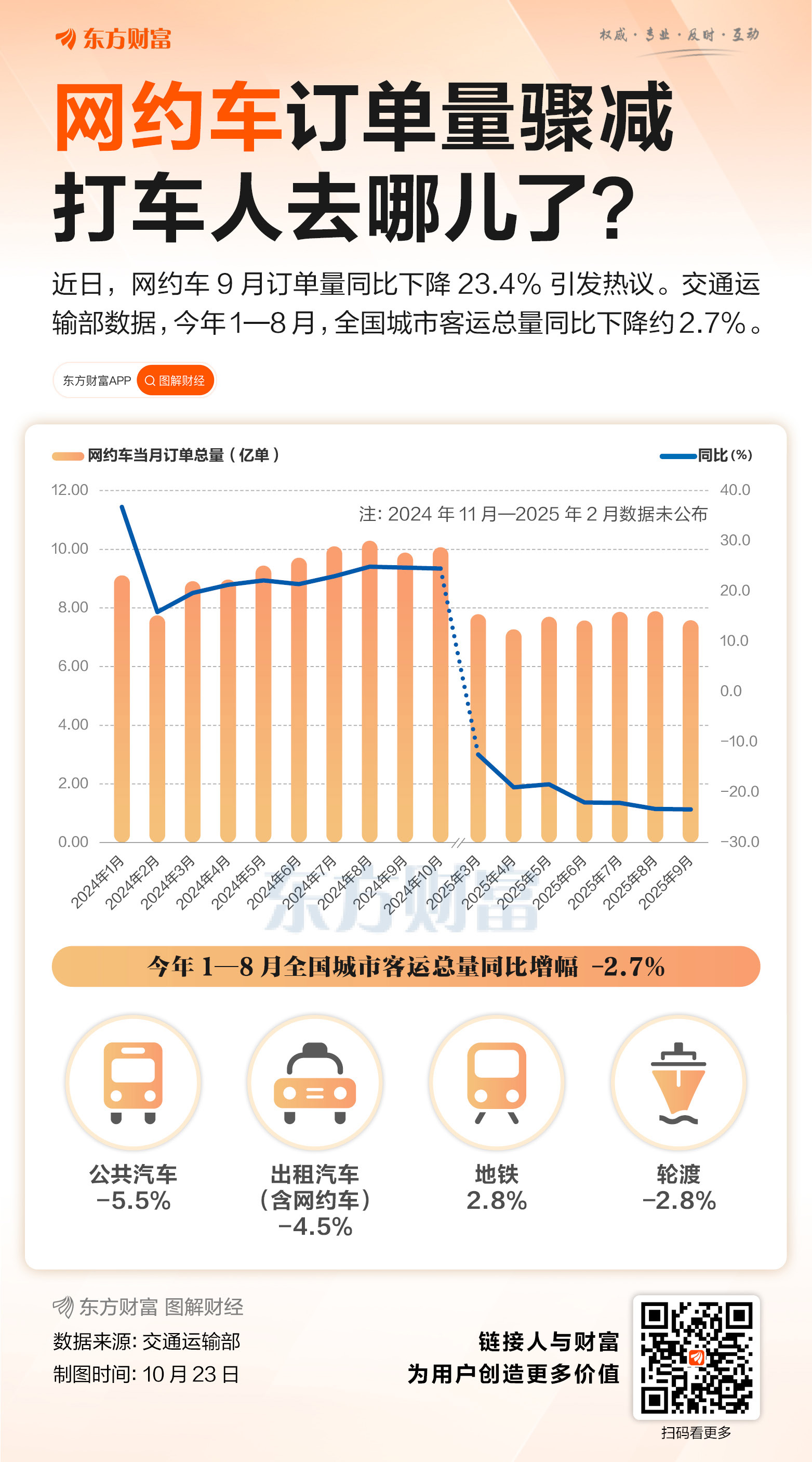 ![]() 近日,网约车9月订单量同比减少23.4%成热议话题。交通运输部数据显示,全国网约车月订单量自7月以来已经三连降,而往年来说,暑期是一年中打车需求最旺盛的时段之一。 人们不禁要问,打车人去哪儿了? 结合交通运输部最新数据,今年1—8月,全国城市客运总量累计688.7亿人次,相比去年同期,减少了近2.7%,且全国所有省市里客运量同比正增长的只有江苏(1.9%)、广东(0.3%)、西藏(2.7%)和新疆(0.4%)。 从出行方式来看,这组数据覆盖了公共汽车、出租车(含网约车)、轨道交通(地铁)和轮渡这四种交通方式。除轨道交通客运量逆势上扬,同比上升2.8%之外,公共汽车、出租车和轮渡同比分别下降5.5%、4.5%和2.8%。 出行方式从“地上”转到“地下”,这不仅是交通方式的变化,更是生活方式的一种变革。当越来越多的城镇居民选择地铁这一相对环保的出行方式,以减少驾车出行的次数来支持碳达峰碳中和,相信“绿色低碳美丽中国”的美好愿景会更快实现。