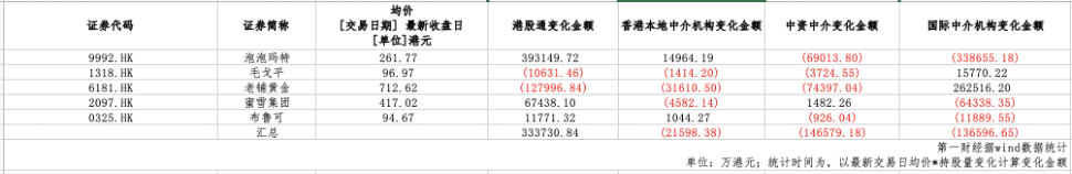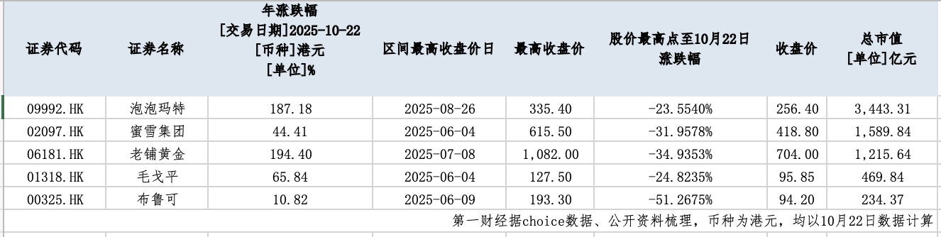 短短几个月时间,曾经风光无限的港股新消费板块,就从一路高歌猛进,走向了“杀估值”的急剧下跌。 10月23日,港股新消费板块持续走低,泡泡玛特(09992.HK)盘中一度跌近11%,最终报收232.4港元/股,跌幅9.36%,最新总市值为3121亿元;两只明星股古茗、蜜雪集团(02097.HK),也分别跌超6%、4%。 目前,泡泡玛特、老铺黄金(06181.HK)、蜜雪集团等明星股,较年内高点已普遍跌幅超20%,三大龙头市值蒸发超2800亿港元。泡泡玛特交出同比增长245%-250%的亮眼三季报后,股价仍连续下挫。 资金流向显示,南下资金虽然仍在流入,但香港本地、国际中介机构的资金,却出现一定程度撤离。 业内人士分析,增长见顶的担忧、商业模式的再审视,以及巨大的获利了结压力,共同构成了本轮调整的三重推手。在当前阶段,机构分歧正在加剧——是短暂回调还是叙事终结,将成为决定板块未来走势的关键。 三大龙头较年内高点蒸发2800亿港元 恒生指数持续震荡之际,年内表现一度领跑港股的新消费板块,近期遭遇集体重挫,多只明星股自年内高点大幅回落。 以潮玩龙头泡泡玛特为例,该股23日盘中跌超10%,最低下探至227.2港元/股,截至收盘下跌9.36%。若以8月26日的历史高点339.8港元计算,在不到两个月内累计跌幅已超过32%。该股在10月初经历短暂反弹后,近期已连续五个交易日收跌。 板块内其他个股同样走势疲软。老铺黄金自10月17日触及846港元/股的阶段高点后持续回落,截至10月23日已跌至692港元,区间跌幅超18%。自7月8日创下的1082港元历史高点以来,该股累计跌幅已超34.93%。蜜雪集团自6月4日冲到615港元的高点至今,回调幅度更超过31%。 此外,截至10月22日,毛戈平、布鲁可,也较年内高点分别下跌超24%、51%。 ![]() 股价大幅回调,使得新消费板块的明星股市值大幅缩水。截至10月23日,泡泡玛特市值自8月26日的4504亿港元高点缩水至3121亿港元;蜜雪集团市值从6月4日的2336亿港元跌落至1518亿港元,退出“2000亿俱乐部”;老铺黄金市值更从7月8日的1868亿港元骤减至1195亿港元。 按上述数据计算,截至10月23日收盘,三家明星股从年内高位合计蒸发市值超2800亿港元。 部分个股即使在业绩向好的背景下仍难挡跌势。10月21日,泡泡玛特在港交所公告,第三季度整体收益(未经审核)同比增长245%-250%,其中中国收益同比增长185%-190%,海外收益同比增长365%-370%。然而,这份亮眼的业绩公告并未提振市场信心,该股在公告后连续两个交易日大幅下跌。 背后推手是谁? 本轮港股新消费板块的调整,背后是资金结构与市场预期的共同转向。通过不同阶段的主力资金流向分析,可清晰看到推动行情演变的主要力量。 上半年的行情中,南下资金是做多港股新消费概念的主力资金。Wind数据显示,4月8日~6月9日,新消费板块中,南下资金和香港本地中介加仓63.7亿港元、4.9亿港元,国际中介和中资中介净流出6.4亿港元、43.9亿港元。 然而,这一格局在7月发生了明显变化。第一财经记者根据Wind数据估算,在7月2日至7月30日期间,南向资金转为净流出,而香港本地中介机构和中资中介则仍保持净流入状态。 近期资金流向揭示了内外资机构在新消费板块上的鲜明分歧。以持股数量变化*最新日成交均价估算,wind数据显示,尽管南下资金仍是做多主力,向5家概念股净流入33.37亿港元;但其他主要机构投资者均在撤退,中资、国际与香港本地中介分别净流出14.66亿港元、13.66亿港元和2.16亿港元。 ![]() 资金转向的背后,暗藏着市场对行业基本面的多重担忧。 增长可持续性首当其冲。以泡泡玛特为例,虽然该公司近期披露的三季报业绩亮眼,但晨星分析师Jeff Zhang指出,投资者担忧泡泡玛特收入增速或于今年见顶,明年起增长动能可能放缓。 第一财经观察发现,泡泡玛特多款热门IP,近期在二手市场上的价格较6月已有显著降低。一名机构人士说,有些机构内部确实会跟踪二手市场的行情。对一些依赖IP和粉丝经济的公司来说,二手价是判断产品真实需求和品牌溢价的试金石。说白了,如果连核心粉丝都不愿高价买了,机构对它的增长故事就会打上问号。但他也强调,这套方法并非绝对,“市场情绪和投机因素都会干扰价格,单凭这个指标做决策可能会误判。” 其次,市场正重新审视新消费企业的商业本质与定位匹配度。 以老铺黄金为例,业内担忧其实际经营模式与高端定位存在明显割裂。招股书显示,该公司产品外包生产比例从2021年的36%攀升至2023年的41%,而同期研发投入占比却从0.67%降至0.35%。虽然标榜奢侈品定位,但其产品价格却随金价频繁波动。 同样面临考验的还有蜜雪冰城,在产能利用率方面持续下滑。第一财经注意到,根据招股说明书,蜜雪集团主要食材的产能利用率整体较低且不断下行。例如,糖的产能利用率,2021年至2024年前三季度分别为58.7%、61.2%、42.2%、46.5%。奶的产能利用率也从2021年的83.1%,降低至2024年前三个月的52.3%。 此外,这些股票前期涨幅巨大,本身也积累了显著的获利了结压力。Choice数据显示,泡泡玛特、老铺黄金、蜜雪集团年内最大涨幅分别达310%、309%和112%。即便经历近期回调,截至10月22日,三者年内涨幅仍分别高达187%、194%和44%,部分投资者选择锁定收益,集中卖出进一步加剧了股价压力。 未来港股新消费概念股能否扭转当前颓势,重现往日高增长辉煌?目前市场观点呈现明显分歧。 招商证券在近期研报中指出,从半年报看,港股新消费板块正