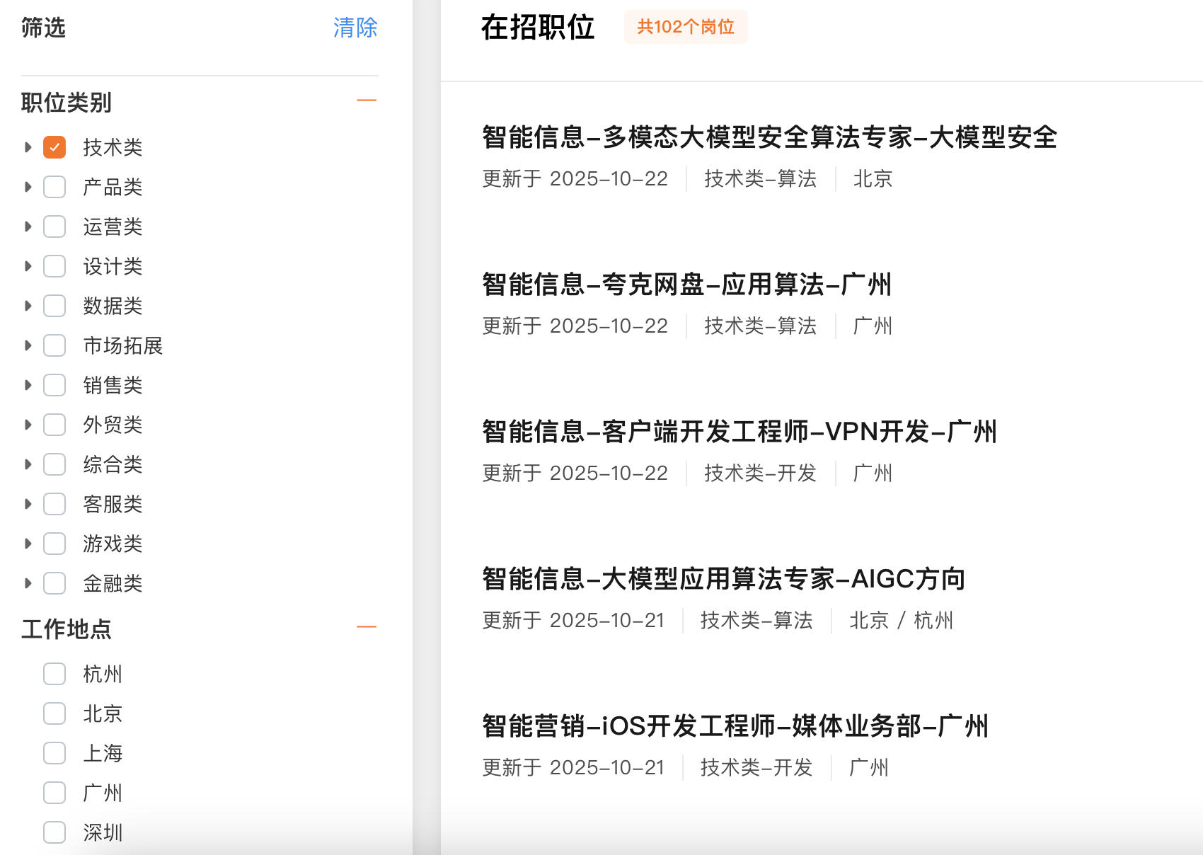 图源:阿里巴巴集团招聘官网截图 时代财经从阿里巴巴集团招聘官网看到,截至目前,智能信息事业群社招还有170个岗位开放,其中技术岗占比达6成。 以旗下夸克为例,其招聘岗位不仅包括模型训练等基础技术,亦有不少岗位涉及学习、健康、创作等垂类场景。 “夸克发展迅猛,年轻人有机会快速参与到重要AI前沿项目的研发和落地,甚至能担任重要岗位角色。目前算法团队博士学历占比很高,也是今年集团‘阿里星’顶尖人才计划引入的大户。”据内部人士介绍。 随着阿里重金押注,技术、产品与人才全面集结,阿里在AI To C的猛攻或将给行业带来更多变数。当搜索框与聊天框的边界不断模糊,这场关于下一代超级入口的战争,已然打响。 (责任编辑:王治强 HF013)