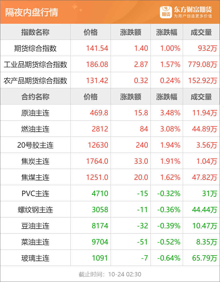 隔夜行情![]() ![]() 每日精选中国共产党第二十届中央委员会第四次全体会议公报 金价历史性暴跌不等于牛市终结!以史为鉴:接下来何去何从? 国际油价大幅拉升!特朗普重大转变 “普特会”取消 宏观产经人民日报:中国共产党第二十届中央委员会第四次全体会议于2025年10月20日至23日在北京举行。全会提出了“十五五”时期经济社会发展的主要目标:高质量发展取得显著成效,科技自立自强水平大幅提高,进一步全面深化改革取得新突破,社会文明程度明显提升,人民生活品质不断提高,美丽中国建设取得新的重大进展,国家安全屏障更加巩固。 商务部:商务部发言人今日回答记者提问时表示,经中美双方商定,中共中央政治局委员、国务院副总理何立峰将于10月24日至27日率团赴马来西亚与美方举行经贸磋商。双方将按照今年以来两国元首历次通话重要共识,就中美经贸关系中的重要问题进行磋商。 商务部:10月23日,欧盟宣布在第19轮对俄制裁中列单中国企业,并首次制裁中国大型炼油厂和石油贸易商,商务部新闻发言人回应称,欧盟不顾中方多次交涉和劝阻,一意孤行,在第19轮对俄制裁中再次列单中国企业,并首次制裁中国大型炼油厂和石油贸易商。中方对此强烈不满、坚决反对。中方将采取必要措施,坚决维护中国企业的正当合法权益,坚决维护自身能源安全和经济发展。 品种资讯黑色系期货 钢材:10月中旬,21个城市5大品种钢材社会库存936万吨,环比减少10万吨,下降1.1%,库存小幅波动;比年初增加277万吨,上升42.0%;比上年同期增加205万吨,上升28.0%。5大品种钢材社会库存环比各有升降,其中螺纹钢减量较大;同比来看,各品种库存均有所上升,其中螺纹钢为增量、升幅最大品种。(中钢协) 据Mysteel,截至10月23日当周,螺纹钢产量由降转增,厂库、社库连续两周下降,表需连续两周增加。螺纹产量207.07万吨,较上周增加5.91万吨,增幅2.94%;螺纹厂库184.63万吨,较上周减少0.01万吨,降幅0.01%;螺纹社库437.48万吨,较上周减少18.93万吨,降幅4.15%;螺纹表需226.01万吨,较上周增加6.26万吨,增幅2.85%。(我的钢铁网) 不锈钢:据Mysteel,截至10月23日,地区性市场不锈钢库存资源总量123680吨,周环比减1.45%,同比增24.73%。其中冷轧不锈钢库存31750吨,环比增11.25%,同比增12.36%;热轧不锈钢库存91930吨,环比减5.19%,同比增54.45%。(我的钢铁网) 焦煤:国盛证券在研报中表示,“反内卷”背景下,超产查处导致的供应受限是本轮煤价上涨的底层逻辑。自7月国家能源局启动核查超产政策后,国内煤炭产量持续承压,7月、8月煤炭产量连续同比下降。而且,后续政策力度将进一步加码。国盛证券分析认为,未来随着政策的持续推进以及市场逐步形成减量保价预期,其对煤炭产量的影响或进一步显现,下半年国内煤炭产量同、环比下降为大概率事件。叠加当前焦煤显著偏低的库存,煤价向上突破的可能性正逐步提升。(中国证券网) 农产品期货 棉花:10月22日,全国标准级棉花(3128B级)加权平均价14772元/吨,周环比上涨98元/吨,月环比下跌452元/吨,同比下跌671元/吨。当前新棉集中上市,供应端压力较大,但籽棉收购价格有所上涨,收购成本抬升叠加丰产幅度低于预期,带动棉价小幅反弹。(国家粮油信息中心) 白糖:10月22日,我国以进口巴西原糖为原料生产的白糖其销售利润约为1865元/吨(关税配额内,15%关税)或755元/吨(关税配额外,50%关税);我国以进口泰国原糖为原料生产的白糖其销售利润约1780元/吨(关税配额内,15%关税)或643元/吨(关税配额外,50%关税)。(我的钢铁网) 棕榈油:近期国际国内棕榈油震荡下行,我国近月船期棕榈油进口价格倒挂幅度扩大。监测显示,10月22日,11、12月船期棕榈油华南到港完税成本分别较大商所棕榈油2601合约价格高186元/吨、266元/吨,倒挂幅度较上周扩大108元/吨、118元/吨。(我的钢铁网) 有色/贵金属期货 沪金:摩根大通预计黄金价格将在2026年第四季度达到每盎司5,055美元,预计将在2028年之前达到6000美元。(财联社) 沪锌:截至本周四(10月23日),七地锌锭库存总量为16.21万吨,较10月16日减少0.06万吨,较10月20日减少0.32万吨,国内库存减少。整体来看,原三地库存减少0.24万吨,七地库存减少0.32万吨。(SMM) 碳酸锂:10月23日,优质碳酸锂市场价格区间在77900—78200元/吨,行情较上一个工作日上调1450元,电池级碳酸锂市场价格区间在77000—78200元/吨,行情较上一个工作日上调1500元,工业级碳酸锂市场价格区间在75900—76400元/吨,行情较上一个工作日上调1500元。(我的钢铁网) 能化期货 烧碱:截至10月23日,全国20万吨及以上固定液碱样本企业厂库库存41.43万吨(湿吨),环比上涨2.73%,同比上调37.78%。本周全国液碱样本企业库容比23.80%,环比上涨0.71%;本周除东北区域库存比环比下滑外,西北、华中、华东、华北、西南、华南区域库容比环比上涨。(隆众资讯) 玻璃:本周全国浮法玻璃产线未有变动,截至10月23日,浮法玻璃行业开工率为76.35%,与16日持平;产能利用率持稳于80.63%,则全国浮法玻璃日产量为16.13万吨,与16日持平,10月17日-10月23日期间,全国浮法玻璃产量持稳于112.89万吨,同比下降0.51%。(隆众资讯) 纯碱:截至10月23日,中国氨碱法纯碱理论利润-32.40元/吨,环比下跌2.70元/吨。周内成本端原盐价格持稳,无烟煤价格震荡上行,成本端呈现增加;纯碱价格弱稳维持,故氨碱法利润继续走低。中国联碱法纯碱理论利润为-161元/吨,环比下跌31.50元/吨。周