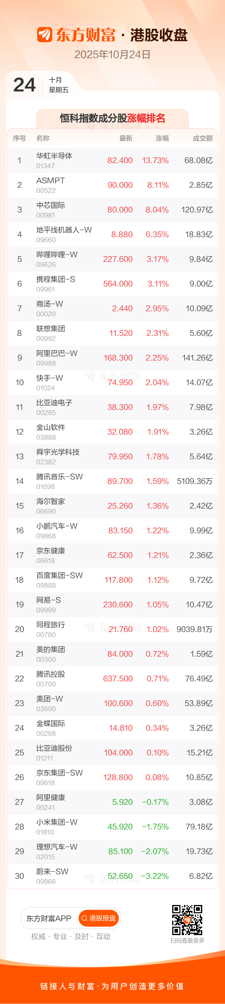 港股10月24日收盘走高,恒生指数收报26160.15点,涨192.17点,涨幅0.74%;恒生科技指数收报6059.89点,涨108.44点,涨幅1.82%。恒生指数成分股中中芯国际、中国宏桥、药明康德涨幅居前,石药集团、龙湖集团、理想汽车-W跌幅靠前。恒生科技指数成分股中华虹半导体、ASMPT、中芯国际涨幅居前,蔚来-SW、理想汽车-W、小米集团-W跌幅靠前。