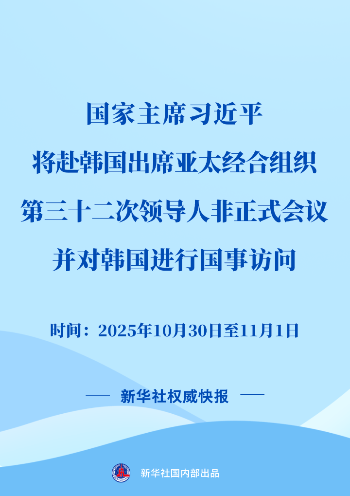 外交部发言人10月24日宣布:应大韩民国总统李在明邀请,国家主席习近平将于10月30日至11月1日赴韩国庆州出席亚太经合组织第三十二次领导人非正式会议并对韩国进行国事访问。