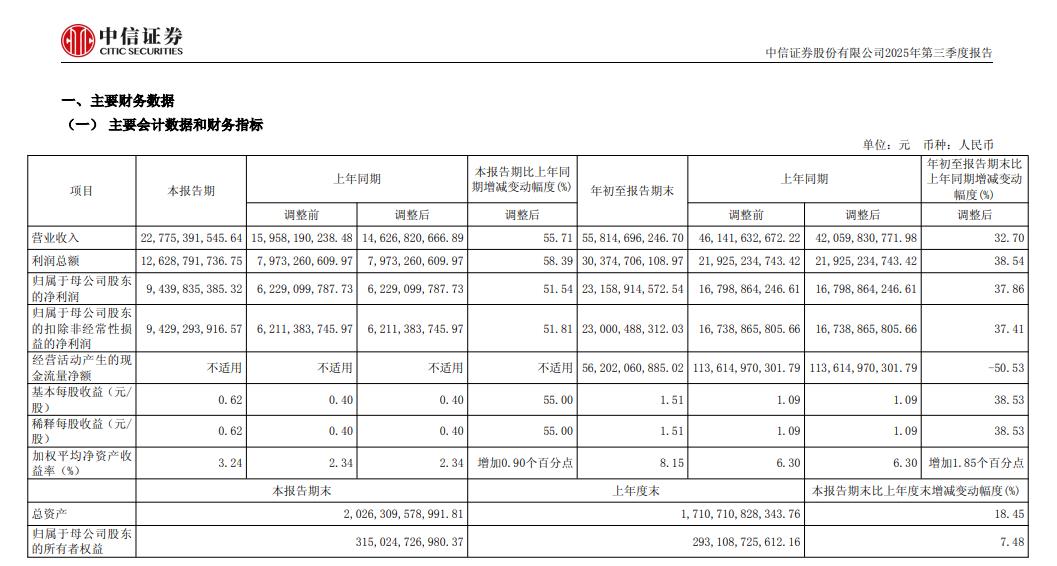 中信证券公告,第三季度营收为227.75亿元,同比增长55.71%;净利润为94.4亿元,同比增长51.54%。前三季度营收为558.15亿元,同比增长32.70%;净利润为231.59亿元,同比增长37.86%。