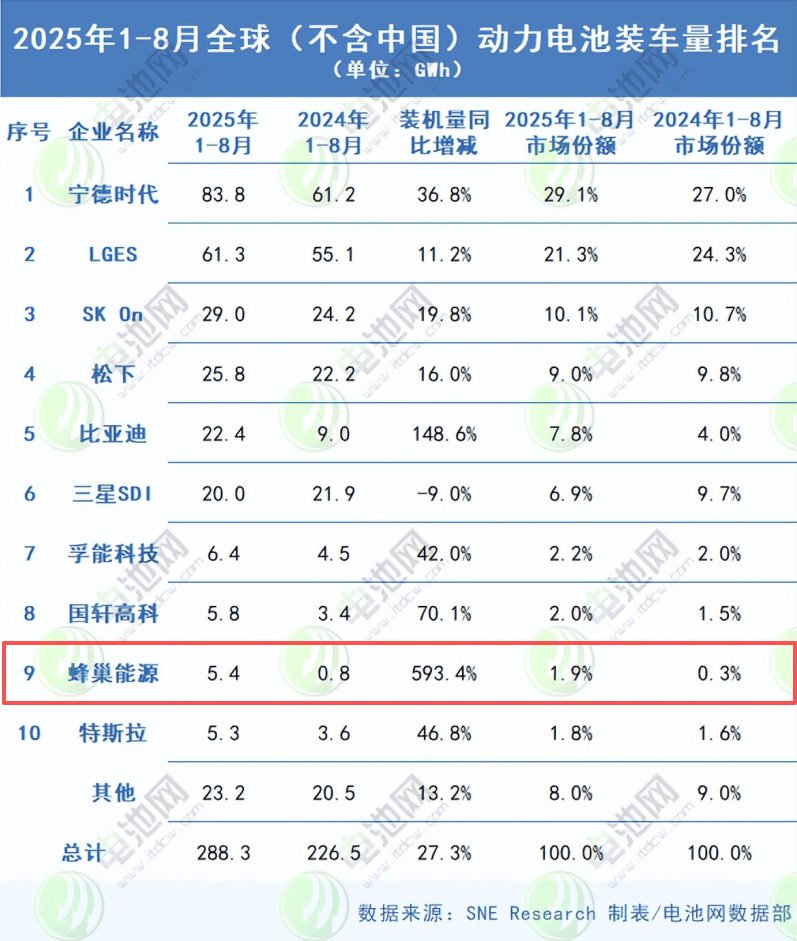 根据韩国研究机构SNE Research最新数据,2025年1-8月,蜂巢能源海外动力电池装车量达5.4GWh,同比大幅增长593.4%,增速高居全球主流电池企业榜首,并跻身海外市场装车量排名前十。与此同时,其全球总装机量达17.5GWh,同比增长98.5%,成功进入全球动力电池装机量前十阵营,成为增长最快的行业“黑马”。