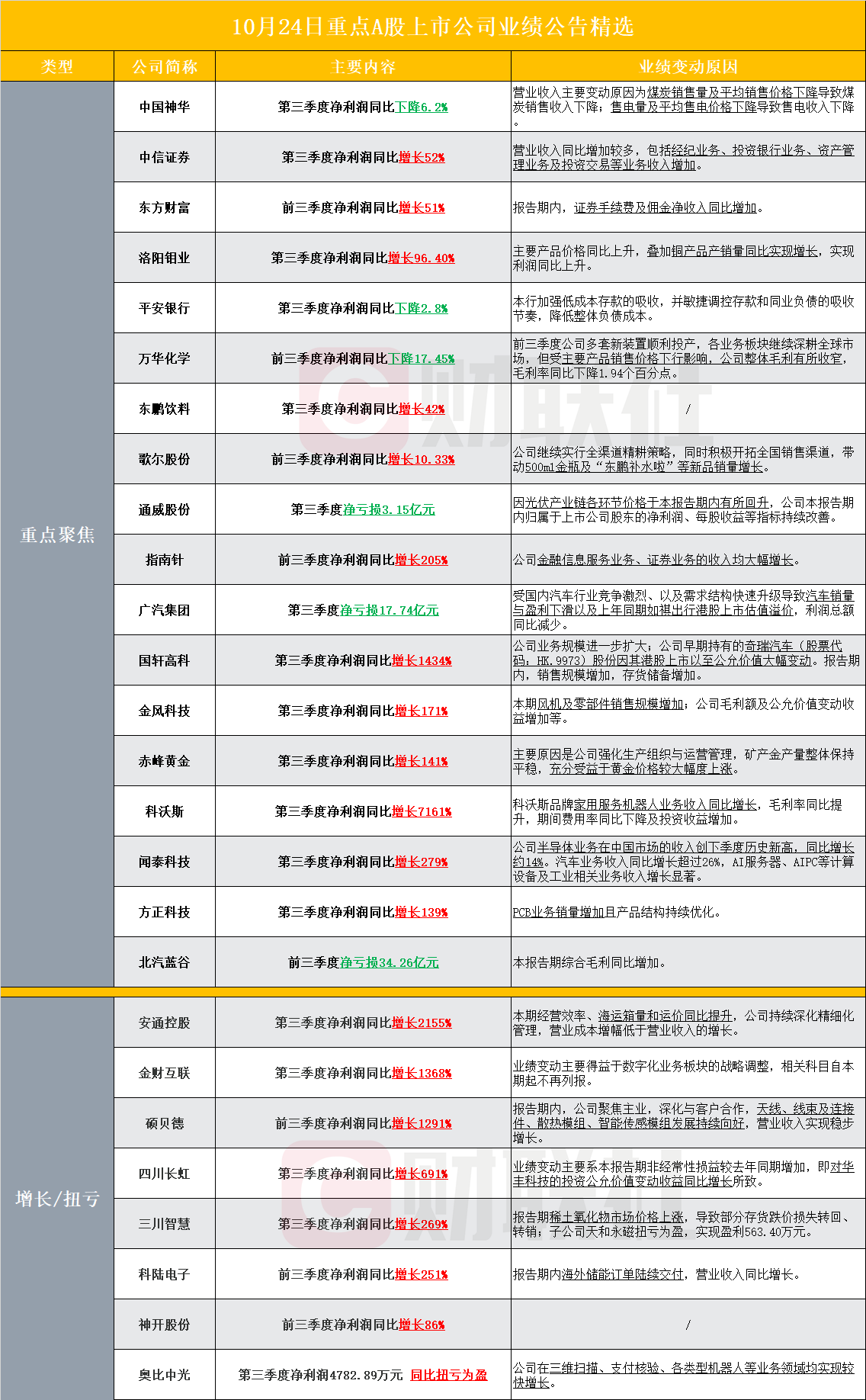 据不完全统计,截至发稿,盘后包括中国神华、中信证券、丁冬财经、洛阳钼业、平安银行、万华化学、东鹏饮料、歌尔股份、通威股份、指南针、广汽集团、国轩高科、金风科技、赤峰黄金、科沃斯、闻泰科技、方正科技、北汽蓝谷、安通控股、金财互联、硕贝德、四川长虹、三川智慧、科陆电子、神开股份、奥比中光等多家A股上市公司发布2025年三季度业绩报告。其中,中国神华第三季度净利润同比下降6.2%,中信证券第三季度净利润同比增长52%。