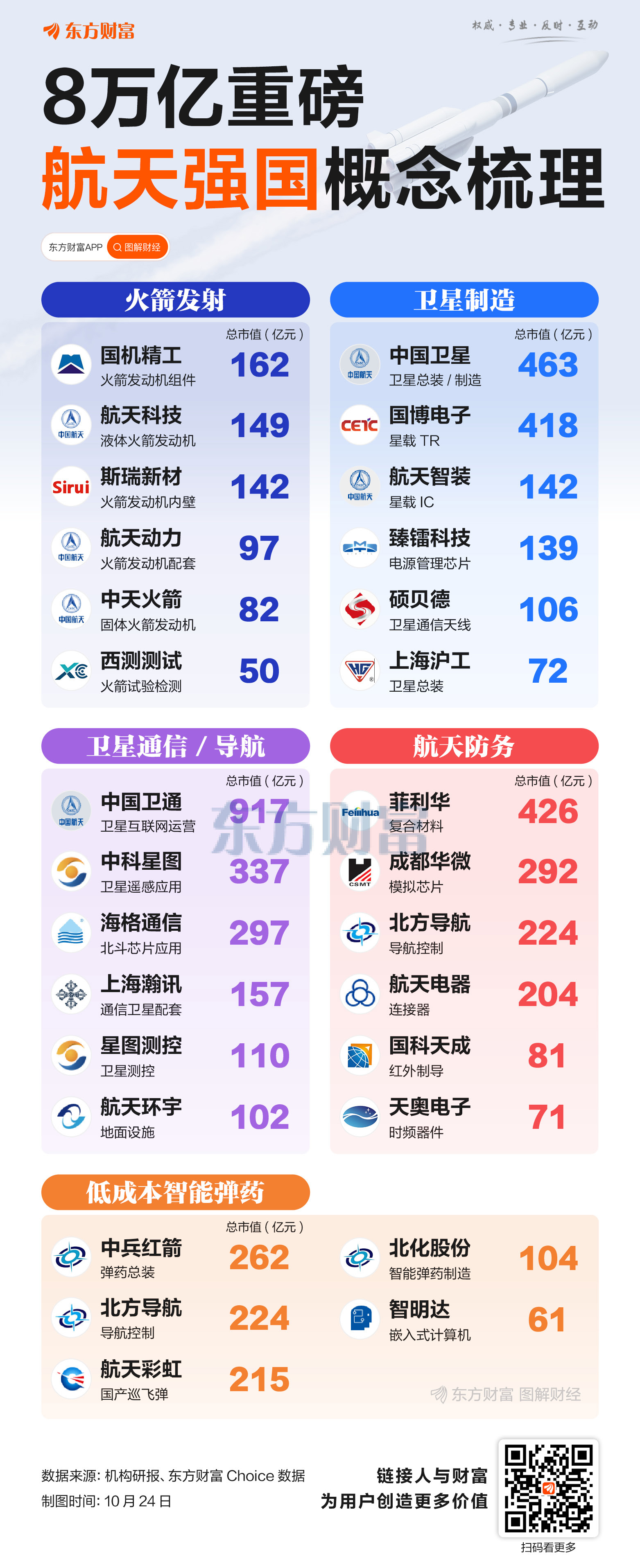 ![]() 周五(10月24日)航天强国概念大爆发,商业航天与卫星领域相关个股强势,航天智装20CM涨停,西测测试大涨超16%,航天环宇涨近12%,中国卫星、上海沪工、国机精工、中天火箭、航天科技等多股涨停,上海瀚讯、中国卫通等跟涨。 消息面上,据新华社报道,四中全会公报中在建设现代化产业体系中新增“航天强国”表述,继“新增长引擎”后商业航天地位再度提升。 另据央视新闻报道,十五五规划的建议还提到要加快新能源、新材料、航空航天、低空经济等战略性新兴产业集群发展,将催生数个万亿元级甚至更大规模的市场。 从全球范围看,国内商业航天市场虽然起步较晚,但发展迅速,根据中国航天工业质量协会的数据,2015-2021年我国商业航天市场规模由3764亿元增至12447亿元,复合增长率近20%。 东吴证券的研报显示,预计到2030年,我国商业航天市场规模将达到7.8万亿元。对标美国SpaceX2016~2025十年间市值增长约40倍至4000亿美元,国内商业航天核心产业链环节亦有望孕育出百亿甚至千亿估值的本土龙头。 民生证券10月24日研报表示,“航天强国”在“十五五”发展目标中被重点提及。今年以来,包括星河动力、天兵科技、蓝箭航天、中科宇航在内的头部商业火箭企业密集开启上市进程,2015年至今,商业火箭公司已经历三次浪潮,从萌芽期到蓬勃发展,再到即将登陆资本市场,其发展路径及盈利模式逐渐清晰,形成了从发射服务稳定可靠,到商业化落地获得更多订单收入的链路。 民生证券并表示,8月底相关部门表示会发放卫星互联网牌照,我国卫星互联网商业运营迈出关键的第一步,牌照的发放有望推动全产业链向规模化加速迈进。对于商业航天产业来说,星座运营位于产业链的下游环节,直接决定了卫星制造、火箭发射、地面设备等中上游环节的需求规模,因此明确的运营主体和业务规范将为整个产业链的可持续发展提供支撑。 民生证券认为,卫星互联网产业的发展路径正持续清晰,在制造端,技术革新为规模化生产奠定基础;在发射端,商业航天发射场的投用与可重复使用火箭技术的发展,将显著降低发射成本、提升运力。此外,手机直连卫星技术的突破,更是为产业开辟了广阔而持久的需求空间。
