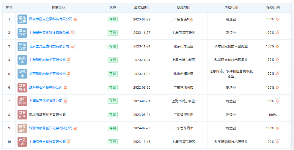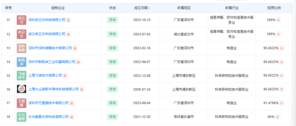 大动作!新凯来当家人“执掌”15亿公司 专业金融数据,下一代智能终端 工商信息显示,近日,深圳市深科装备技术有限公司(下称“深科装备”)发生工商变更,陈勉冬卸任法定代表人、执行董事、总经理,由余海接任法定代表人,并担任董事、经理。 ![]() 深科装备成立于2022年2月,注册资本约15亿人民币,经营范围包括智能基础制造装备销售、半导体器件专用设备销售、电子专用设备销售等。 深科装备由新凯来旗下深圳市新凯来工业机器有限公司全资持股。 工商信息显示,余海目前担任新凯来的法定代表人、董事兼总经理。此外,他同时在深圳市新凯来技术有限公司、长光集智光学科技有限公司、深圳市新凯来工业机器有限公司、深圳市星光立索科技有限公司、深圳市万里眼技术有限公司等16家企业中担任法定代表人。 《科创板日报》记者注意到,截至目前,新凯来外对外投资的子公司共8家,分别是长光集智光学科技有限公司、深圳市新凯来工业机器有限公司、深圳市星光立索科技有限公司、深圳市万里眼技术有限公司、北京新凯来技术有限公司、上海新凯来技术有限公司、珠海基石科技有限公司、武汉启云方科技有限公司。 ![]() 从控制企业来看,新凯来控制企业多达18家,其中,12家投资比例达100%,分别为深圳市星光立索科技有限公司、上海星光立索科技有限公司、北京星光立索科技有限公司、上海新凯来技术有限公司、北京新凯来技术有限公司、珠海基石科技有限公司、上海基石化学有限公司、深圳市基石化学有限公司、珠海市横琴基石化学有限公司、上海启云方科技有限公司、深圳启云方科技有限公司、武汉启云方科技有限公司。 7家持股比例达90%以上,为深圳市深科装备技术有限公司、深圳市新凯来工业机器有限公司上海飞埃技术有限公司、上海大尘微影半导体科技有限公司、深圳市万里眼技术有限公司;长光集智光学科技有限公司投资比例为60%。 ![]() ![]() 众多子公司也覆盖了半导体产业链多个环节,长光集智光学科技有限公司具体专业方向包括光学系统设计与优化、光学表面加工与检测、光学薄膜制备、机电一体联合设计仿真、系统装调与测试等;珠海基石科技有限公司拥有高纯化学品制造产线,提供电子化学材料,产品广泛应用于国内顶级制造企业和研究测试机构。 其中,深圳市万里眼技术有限公司(下称“万里眼”)、武汉启云方科技有限公司(下称“启云方”)在2025湾芯展上曝光在公众视野。 现场展会上,万里眼发布新一代超高速实时示波器,该产品带宽突破90GHz,将国产示波器性能提升到500%;启云方发布两款拥有完全自主知识产权的国产电子工程EDA(原理图和PCB)设计软件,已有超过2万名工程师使用。 万里眼CEO刘桑曾在接受《科创板日报》记者专访时表示,新凯来旗下涵盖多家子公司,对于万里眼来说,新凯来主要承担股东责任。 全新妙想投研助理,立即体验 (文章来源:科创板日报) |