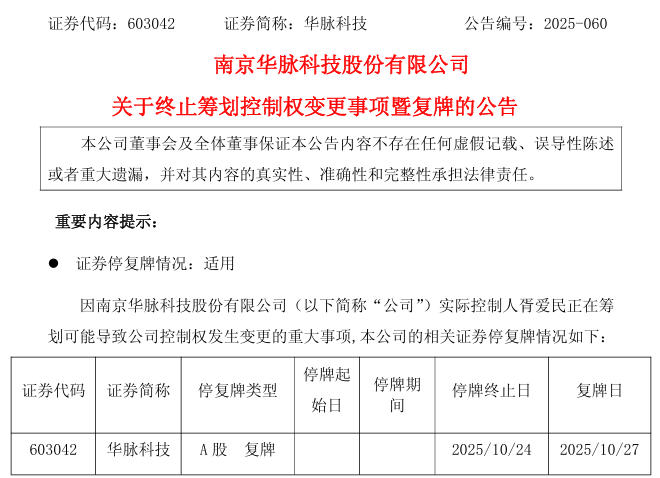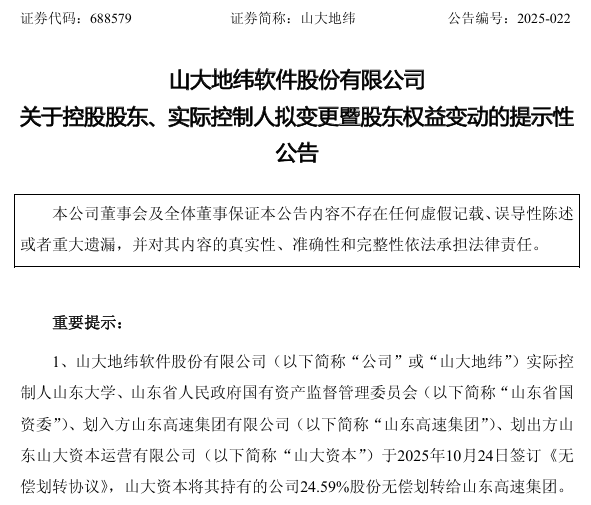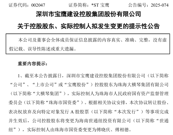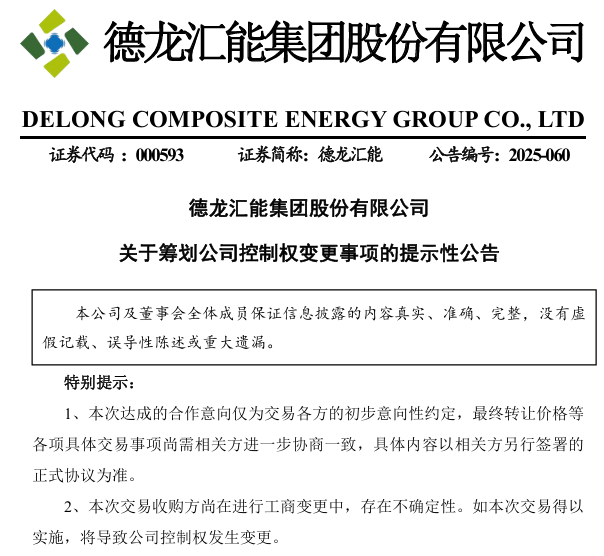 事关控制权变更。 德龙汇能(000593)10月24日公告,公司控股股东北京顶信瑞通科技发展有限公司与东阳诺信芯材企业管理合伙企业(有限合伙)(下称“诺信芯材”)签订了《股份转让之意向协议》,拟将其持有公司29.64%股份转让给诺信芯材,(交易)可能导致公司控制权发生变更。目前,各方主体正在就具体交易方案、协议等相关事项进行磋商,尚存在重大不确定性。 ![]() 公告称,若上述股权转让最终实施完成,公司的实际控制人将发生变更,该事项不会对公司的正常生产经营和持续发展造成不利影响。同时,本次公司控制权拟变更事项不涉及要约收购,不存在损害公司和中小股东利益的情形。 德龙汇能主要从事城市燃气业务、LNG类业务、综合能源类业务等。 共进股份(603118)10月24日公告,公司近日收到大股东唐佛南及其一致行动人崔正南、汪大维及其一致行动人王丹华通知,其正在筹划有关公司的股权转让事宜,该事项可能导致公司的控制权变更。 ![]() 公司表示,鉴于该事项正在洽谈中,尚存在不确定性,经向上交所申请,公司股票自10月27日(星期一)开市起停牌,预计停牌时间不超过2个交易日。 共进股份系信息与通信产品提供商,主要产品覆盖PON、AP、DSL、机顶盒、小基站等网通业务,交换机、服务器、CM模式产品等数通业务,以及汽车电子、EMS业务等AI硬件制造业务。 *ST宝鹰(002047)10月24日公告,公司拟向海南世通纽投资有限公司(简称“世通纽”)发行股票不超过4.23亿股,募资不超过8亿元,扣除发行费用后拟用于补充流动资金和偿还债务。 ![]() 另外,公司控股股东珠海大横琴集团有限公司(简称“大横琴集团”)拟将所持公司5.01%股份及其所对应的所有股东权利和权益转让给世通纽,转让价格为每股不低于4.67元,股份转让价款合计为不低于3.55亿元(含税)。同时,世通纽与大横琴集团及其关联方大横琴股份(香港)有限公司签署《表决权放弃协议》,约定大横琴集团无条件放弃行使其持有的全部*ST宝鹰股份对应的表决权;大横琴股份(香港)有限公司无条件放弃行使其持有的*ST宝鹰对应股份数量为3032.46万股的表决权。 根据相关协议安排,本次协议转让股份、表决权放弃及向特定对象发行A股股票等事项完成并生效后,公司控股股东变更为世通纽,实际控制人变更为傅晓庆、傅相德。公司股票自10月27日开市起复牌。 *ST宝鹰作为控股平台型上市公司,通过旗下宝鹰建科开展建筑、装饰工程施工等主营业务,致力于为客户提供包括建筑、装饰工程施工、承建管理在内的一体化综合解决方案。 同日,山大地纬(688579)公告,公司实际控制人山东大学、山东省人民政府国有资产监督管理委员会(简称“山东省国资委”)、划入方山东高速集团有限公司(简称“山东高速集团”)、划出方山东山大资本运营有限公司(简称“山大资本”)于2025年10月24日签订《无偿划转协议》,山大资本将其持有的公司24.59%股份无偿划转给山东高速集团。 ![]() 公告称,若本次无偿划转顺利完成,公司控股股东、实际控制人将发生变化,控股股东由山大资本变更为山东高速集团,实际控制人由山东大学变更为山东省国资委。本次权益变动后,山大资本仍持有公司4.99%的股份。 山大地纬主要业务包括智慧人社、智慧医保、智能用电等业务,公司收入主要来自各级人社局、医保局、数据局等政府部门、医疗机构、国家电网及社会企业等客户。 此外,10月20日华脉科技(603042)因筹划控制权变更事项停牌。10月24日晚间该公司披露,停牌期间,公司就筹划控制权变更事项进行了充分探讨,但由于涉及事项较多,与交易对方就核心事项未达成共识,经慎重考虑,交易双方决定终止筹划本次重大事项。经公司向上海证券交易所申请,公司股票将于2025年10月27日(星期一)上午开市起复牌。 ![]() 华脉科技是一家信息通信网络基础设施解决方案提供商,致力于在通信领域为客户创造价值,提供行业领先的产品与解决方案。