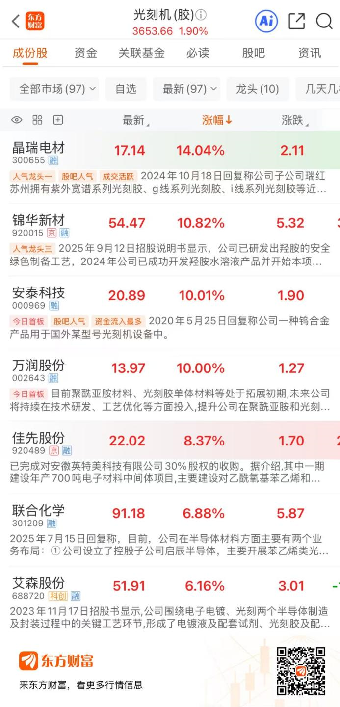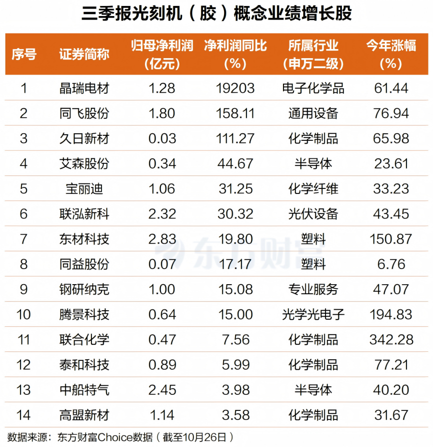 ![]() 10月27日早盘,A股光刻胶板块大涨,截至发稿,晶瑞电材涨超14%,锦华新材涨超10%,安泰科技、万润股份涨停,佳先股份涨超8%,联合化学、艾森股份涨超6%,彤程新材、钢研纳克、南大光电、江化微等涨超5%。 消息方面,国家标准委网站显示,我国首个EUV光刻胶标准——《极紫外(EUV)光刻胶测试方法》作为拟立项标准。标准的起草单位包括上海大学、张江国家实验室、上海华力集成电路制造有限公司、上海微电子装备(集团)股份有限公司。 EUV光刻胶是极紫外光刻的关键材料,主要应用于7nm及以下制程的集成电路制造,是实现先进逻辑芯片、高端存储芯片等微小化、高性能芯片生产的不可或缺的材料。当前,EUV光刻胶完全被国外先进半导体材料公司所垄断(JSR、东京应化等占据超过95%全球市场份额),国产化率为零。 目前,国内在EUV光刻胶测试领域尚未建立统一的技术规范,标准的统一可明确光刻胶各项性能的最低要求和测试方法,确保不同批次、不同供应商的光刻胶能稳定适配EUV光刻机,避免因材料波动导致芯片图案缺陷。同时,减少芯片制造企业的适配测试成本,降低因材料不兼容引发的生产中断风险,提升先进制程芯片的良品率。 上市公司方面,已有多家公司开始研究EUV光刻胶。瑞联新材、久日新材等在投资者互动平台上发布过EUV光刻胶相关的内容,包括研发、开发情况,上海新阳在2024年度业绩说明会上表示,EUV光刻胶是公司光刻胶布局的重要研发方向之一,现在还在研发的初期阶段。 随着国产替代的不断推进、政策的强力支持以及关键技术的持续突破,国内光刻机产业链中已有多家公司业绩明显回暖。 据东方财富Choice数据,截至10月26日,A股光刻机(胶)板块中已有二十余家公布了今年三季报,其中14家公司净利润同比增长。晶瑞电材净利润同比增幅最大,达192倍,同飞股份、久日新材净利润同比翻倍有余,艾森股份、宝丽迪等同比增超30%。 ![]() (文章来源:东方财富研究中心) |