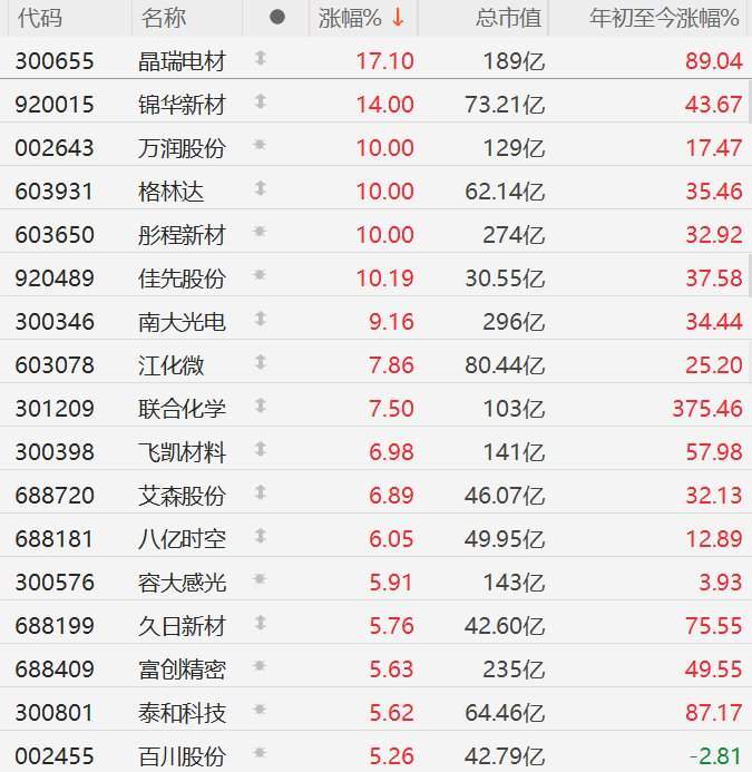格隆汇10月27日|A股市场光刻胶概念股集体走强,其中,晶瑞电材涨超17%,锦华新材涨超14%,佳先股份涨超10%,万润股份(002643)、格林达、彤程新材(603650)10CM涨停,南大光电(300346)涨超9%,江化微(603078)、联合化学涨超7%,飞凯材料(300398)、艾森股份、八亿时空涨超6%,容大感光(300576)、久日新材、富创精密、泰和科技、百川股份(002455)涨超5%。