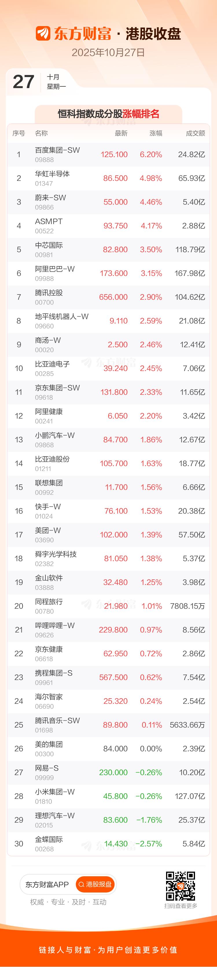 港股10月27日收盘走高,恒生指数收报26433.7点,涨273.55点,涨幅1.05%;恒生科技指数收报6171.08点,涨111.19点,涨幅1.83%。恒生指数成分股中百度集团-SW、药明康德、中芯国际涨幅居前,李宁、吉利汽车、理想汽车-W跌幅靠前。恒生科技指数成分股中百度集团-SW、华虹半导体、蔚来-SW涨幅居前,金蝶国际、理想汽车-W、小米集团-W跌幅靠前。