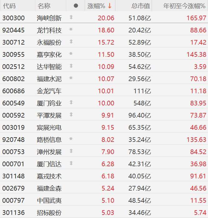 格隆汇10月27日|A股市场福建概念股走强,其中,海峡创新20CM涨停,龙竹科技涨超18%,永福股份涨超15%,嘉亨家化涨超11%,达华智能、福建水泥、金龙汽车、厦门钨业、平潭发展10CM涨停,宸展光电涨超9%,路桥信息涨8%,漳州发展涨近8%,厦门信达、嘉戎技术涨超6%,福建金森、中国武夷、招标股份涨超5%。