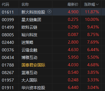 加密货币概念股普涨,新火科技控股涨超11%。10月27日,比特币升破115000美元,日内涨3.35%。其他主流加密货币均出现上涨行情,其中,以太坊价格突破4200美元,日内涨超7%。